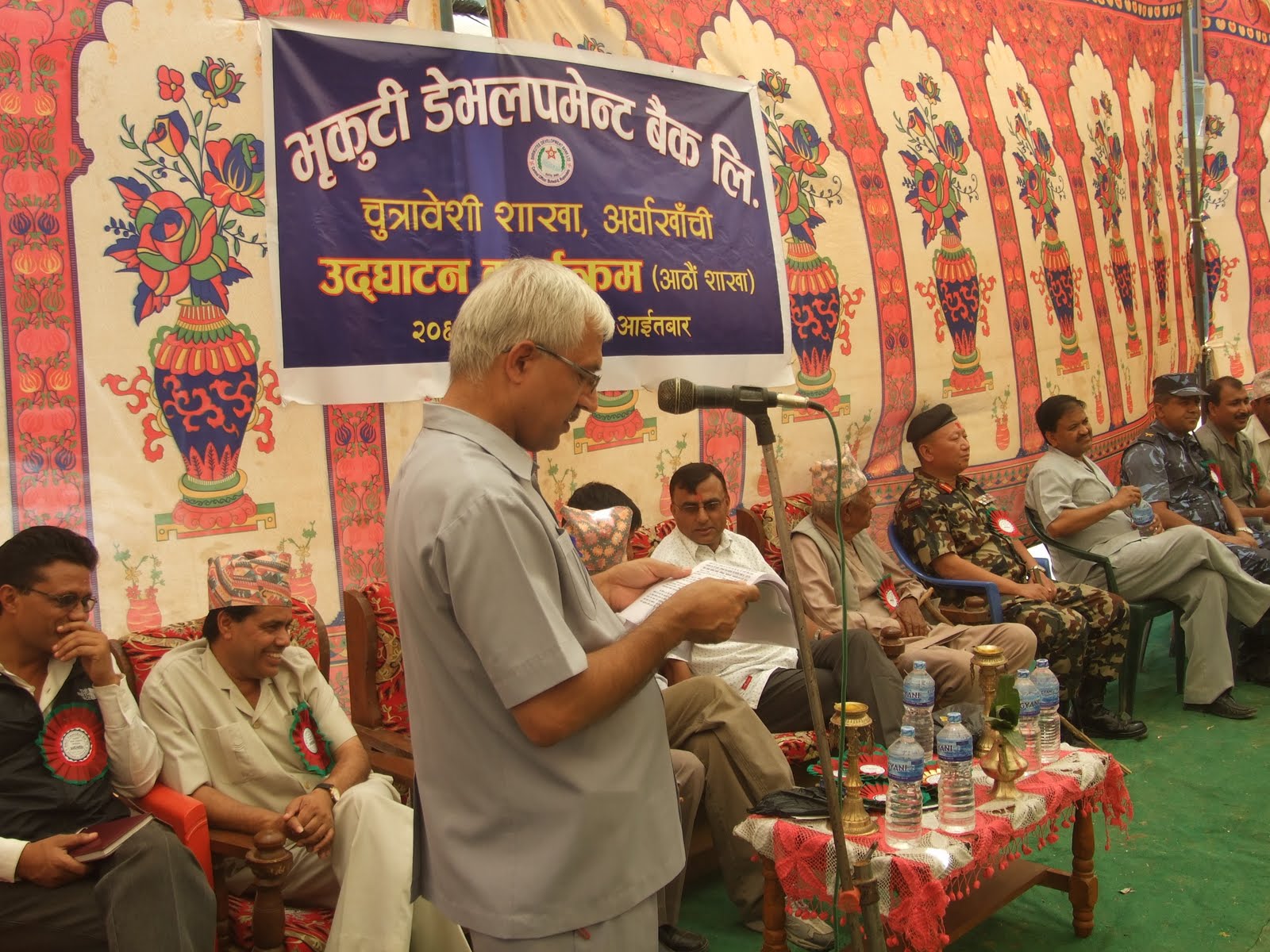 उदघाटन कार्यक्रममा प्रमुख जिल्ला अधिकारी बलभद्र गिरी, स्थानीय विकास अधिकारी पुण्यविक्रम पौडेल, उद्यागे वाणिज्य संघका सचिव नेत्र भुसाल, माओवादीका जिल्ला ईन्चार्ज चन्द्र बहादुर खडका, काग्रेसका कमल प्रसाद भुसाल, एमालेका रामजी प्रसाद घिमिर, राजमोका सागर केसी, राप्रपाका देवी बहादुर खडका, पत्रकार महासंघका अध्यक्ष नीम बहादुर रीजाल लगायतले बैकको सफलताको शुभकामना दिएका थिए ।