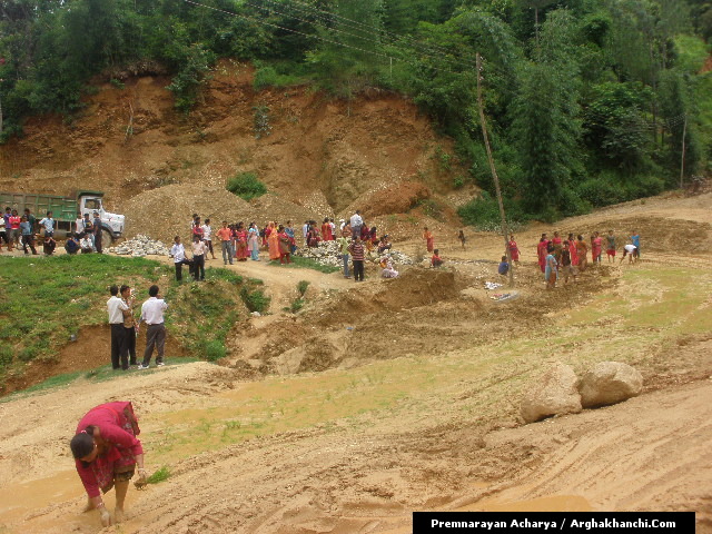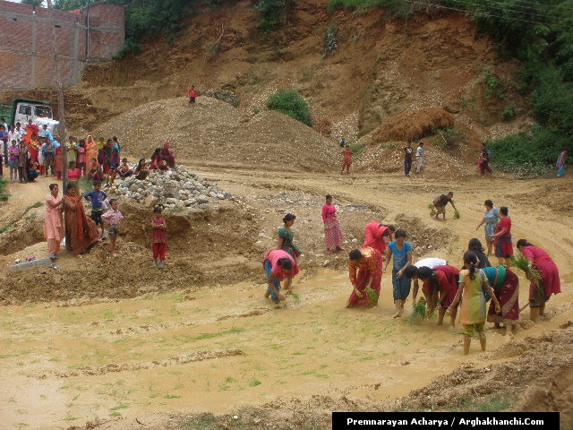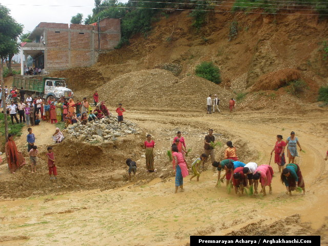 अर्घाखाँची ८ साउन । बिगत २ महिना देखि अर्घाखाँचीको सदरमुकाम सन्धिखर्कको बिचमा रहेको गुन्टी खोलामा बाटो हिलो भएर दुर्घटना बढ्ने सम्भाबना बढ्दा समेत स्थानीय निकायको बाटो मर्मतमा ध्यान नगएपछि आज स्थानीय महिलाहरुलॆ बिरोध स्वरुप सडकमा रोपाई गरेका छन् ।