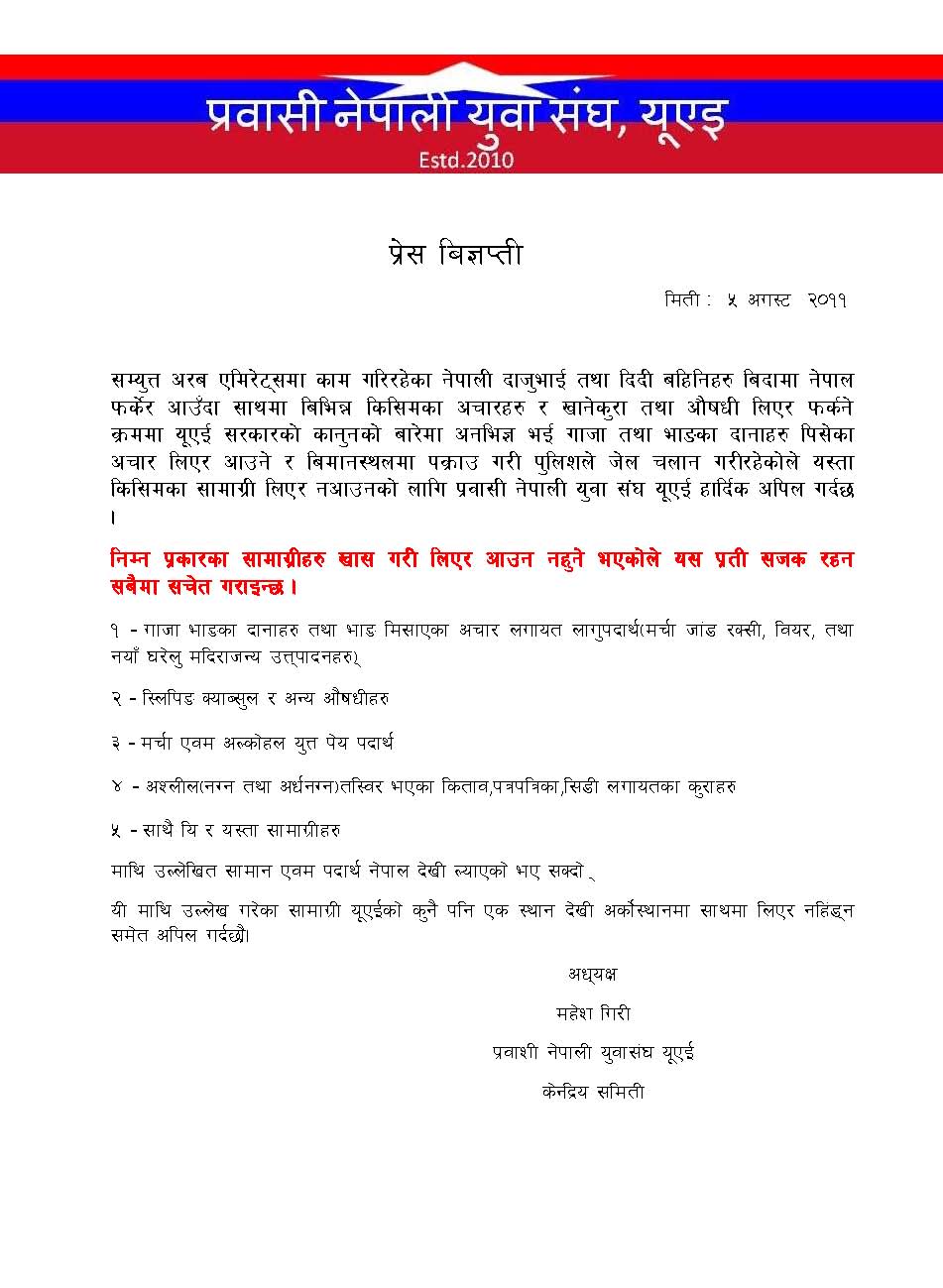 सम्युत्त अरब एमिरेट्समा काम गरिरहेका नेपाली दाजुभाई तथा दिदी बहिनि लाई सम्बोधन गरी युवासंघका अध्यक्ष महेश गिरी द्वारा जारी गरिएको बिज्ञप्तीमा बिदामा नेपाल फर्केर आउँदा तथा पहिलो पटक यूएई भित्रिने क्रममा साथमा बिभिन्न किसिमका अचारहरु,खानेकुरा तथा औषधी लिएर फर्कने क्रममा यूएई सरकारको कानुनको बारेमा अनभिज्ञ भई गाजा तथा भाङका दानाहरु पिसेका अचार लिएर आउने र बिमानस्थलमा पक्राउ गरी पुलिशले जेल चलान गरीरहेकोले यस्ता किसिमका सामाग्री लिएर नआउनको लागि प्रवासी नेपाली युवा संघ यूएई हार्दिक अपिल गर्दछ भनिएको छ।