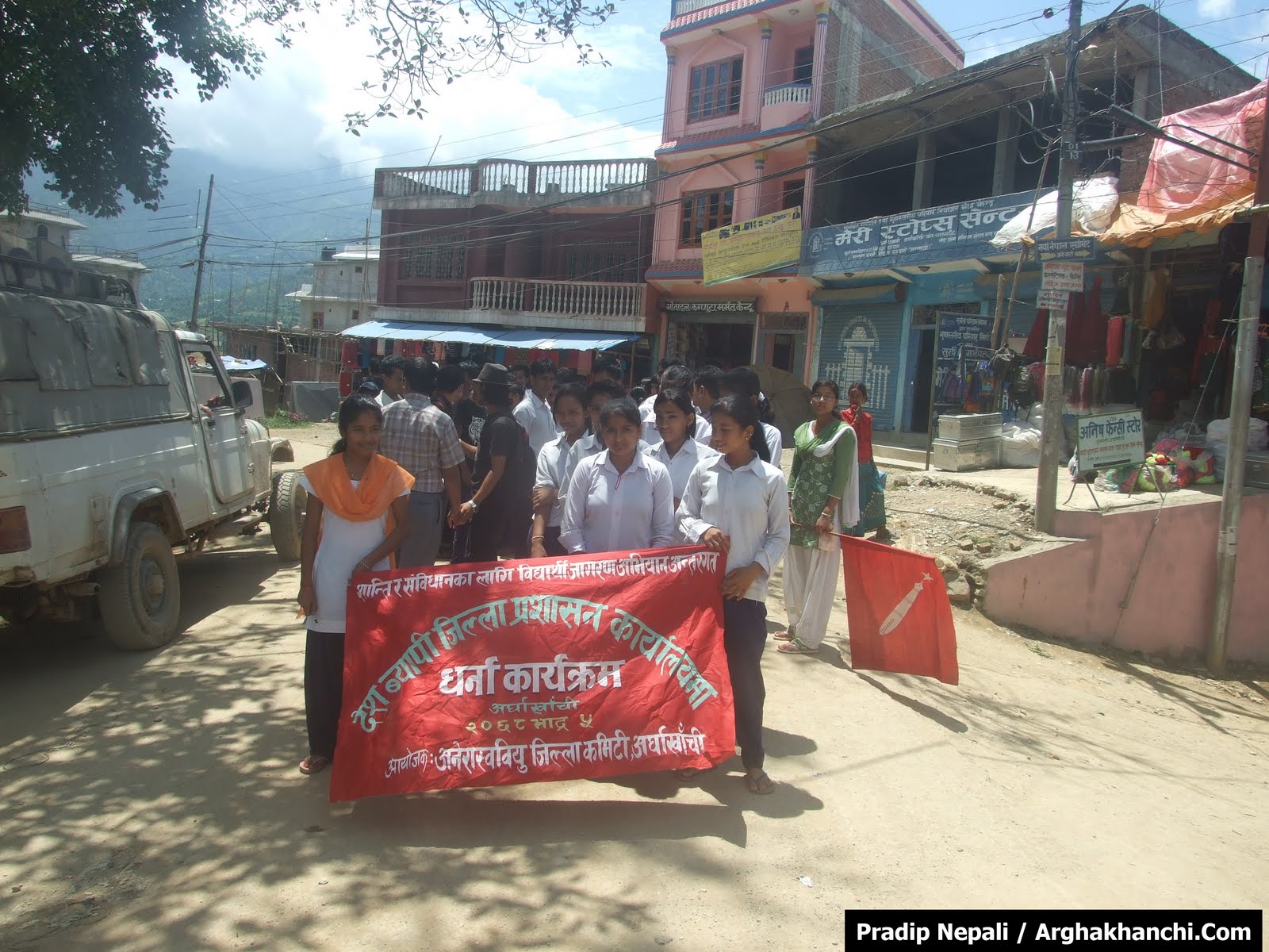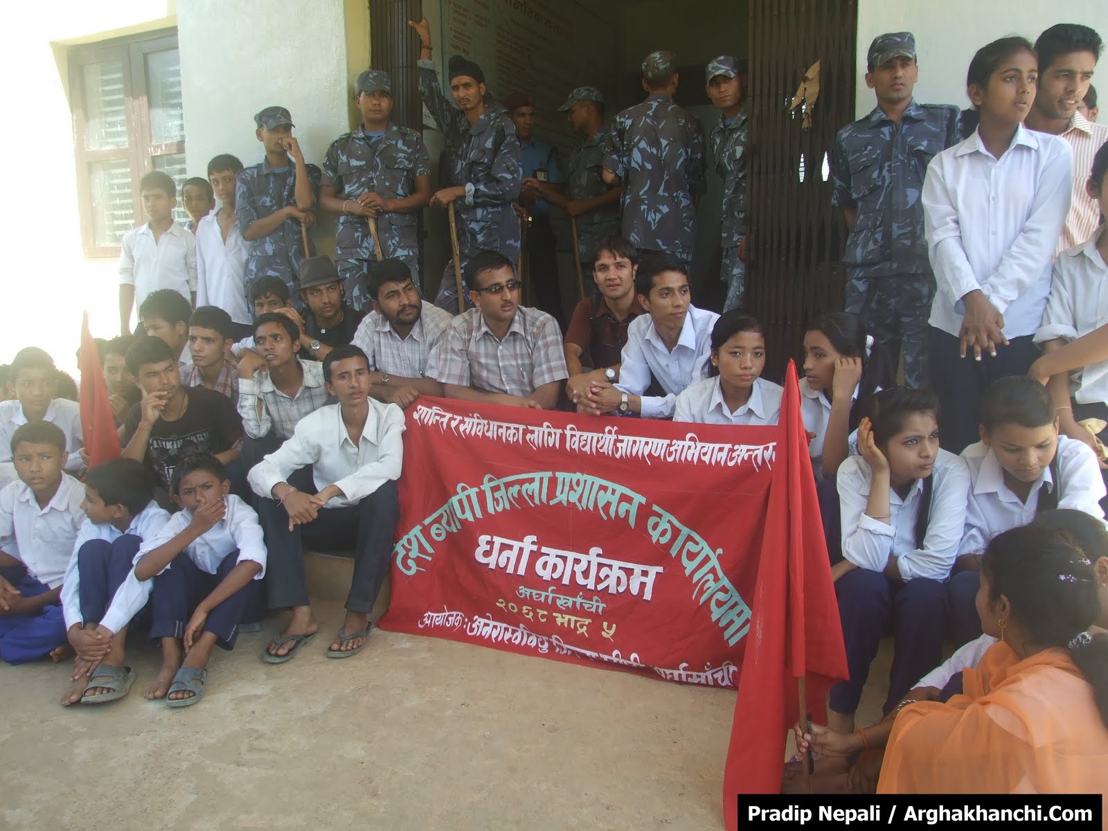 सन्धिखर्क, अर्घाखाँची । भदौं १४ भित्रै शान्ति प्रक्रिया र संविधान बनाउनका लागि दबाब स्वरुप एमाले निकट अखिल नेपाल राष्ट्रिय स्वतन्त्र विद्यार्थी युनियन अनेरास्ववियूले अर्घाखाँची जिल्ला प्रशाशन कार्यालय सन्धिखर्कमा १ घण्टा धर्ना दिएको छ।