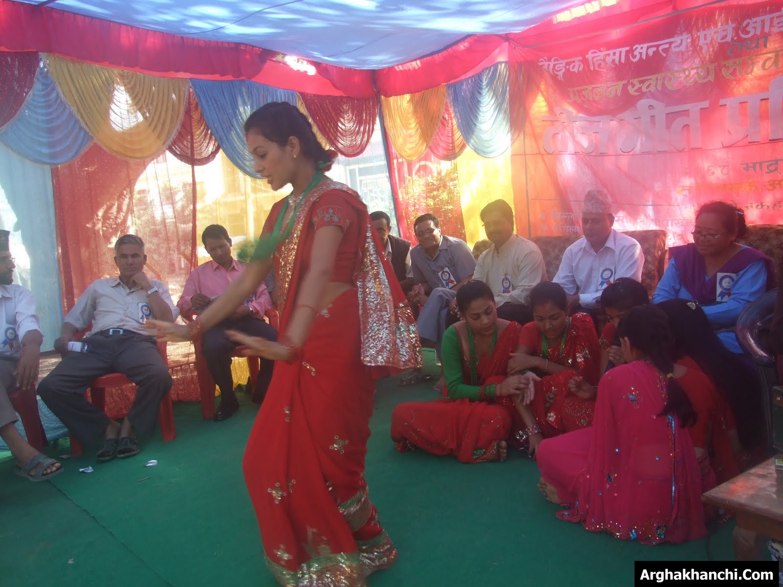 यसैबिच सामुदायिक रेडियो अर्घाखाँचीले विभिन्न संघ-संस्थाको सहयोगमा आयोजना गरेको तिज गित प्रतियोगितामा जिल्ला स्थित कार्यालयका प्रमुख र राजनीतिक दलका नेताहरु एकसाथमा छमछमी नाचेका छन् । दर्शकहरुको आग्रह पछि प्रमुख जिल्ला अधिकारी केशव राज घिमिरे माओवादी जिल्ला ईन्चार्ज चन्द्र बहादुर खड्का उज्ज्वल, जिल्ला सेक्रेटरी ठाकुर कुमार बिक नेपाली कांग्रेसका जिल्ला सभापति कमल प्रसाद भुसाल युवा नेता विष्णु मुस्कान एमाले अध्यक्ष रामजी प्रसाद घिमिरे प्रचार विभाग प्रमुख प्रेम नारायण गैरे एकिकृत क्रान्तिकारीका केन्द्रीय सदस्य यमुना भुसाल महिला विकास अधिकृत जमुना भण्डारी लगायतका नेता तथा कार्यालय प्रमुखहरु कम्मर मर्काई मर्काई छमछमी नाचेको दृश्य साच्चै हेर्न लायक थियो ।