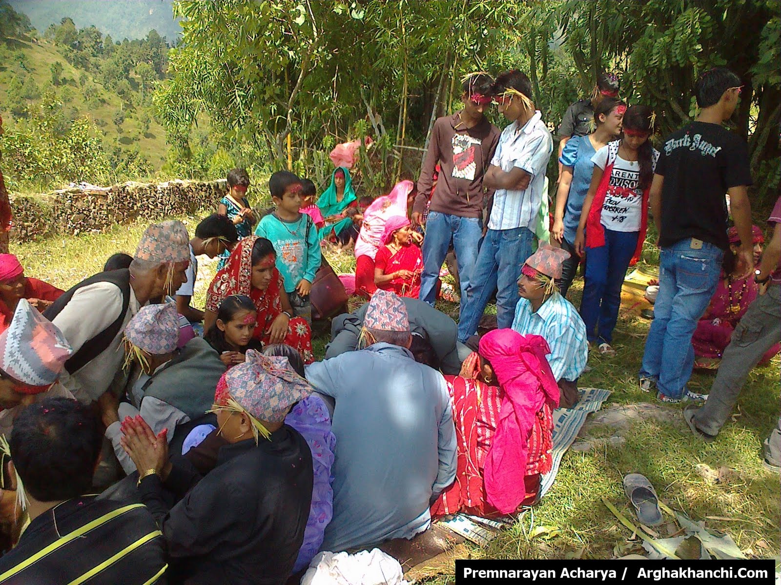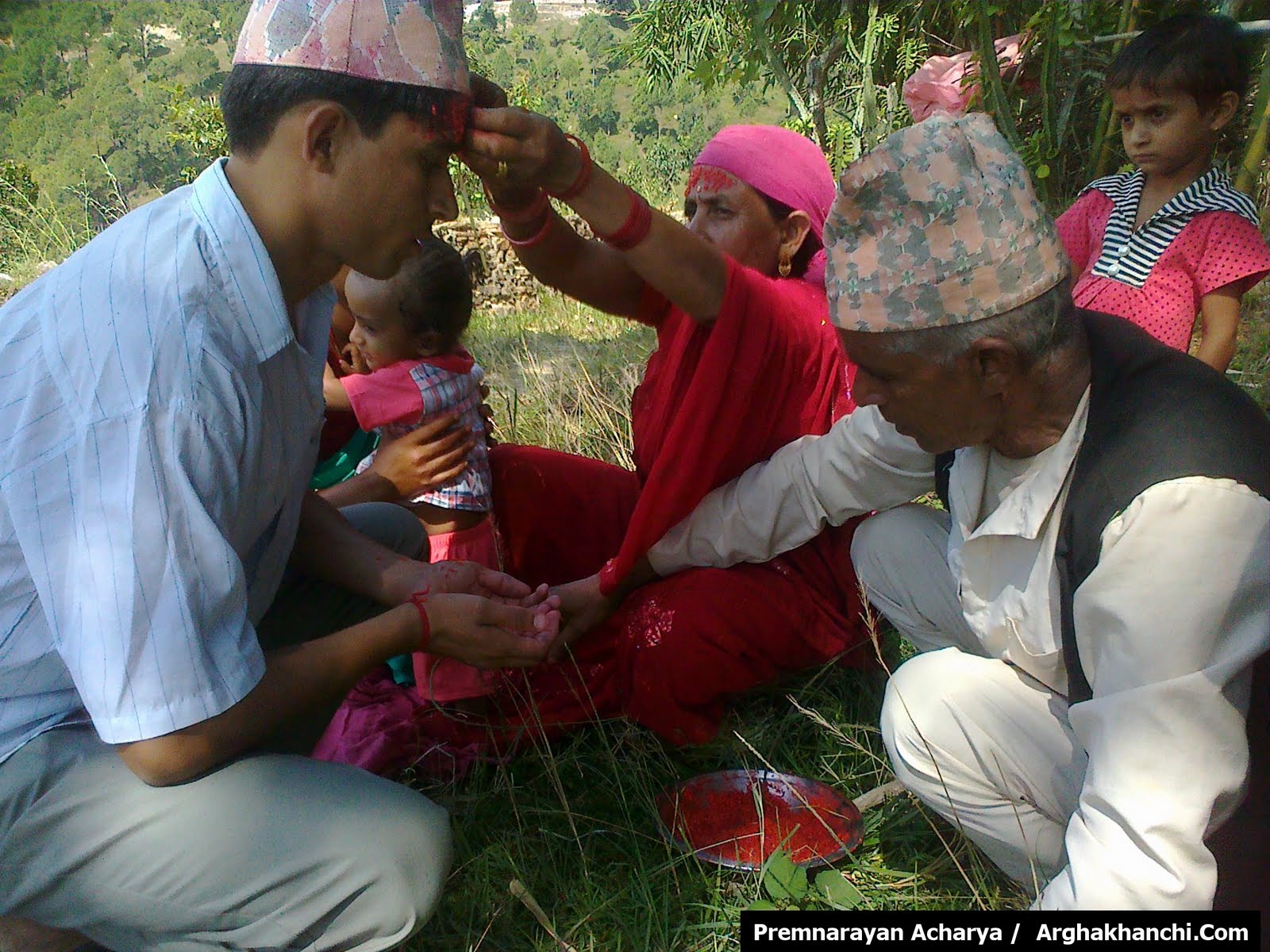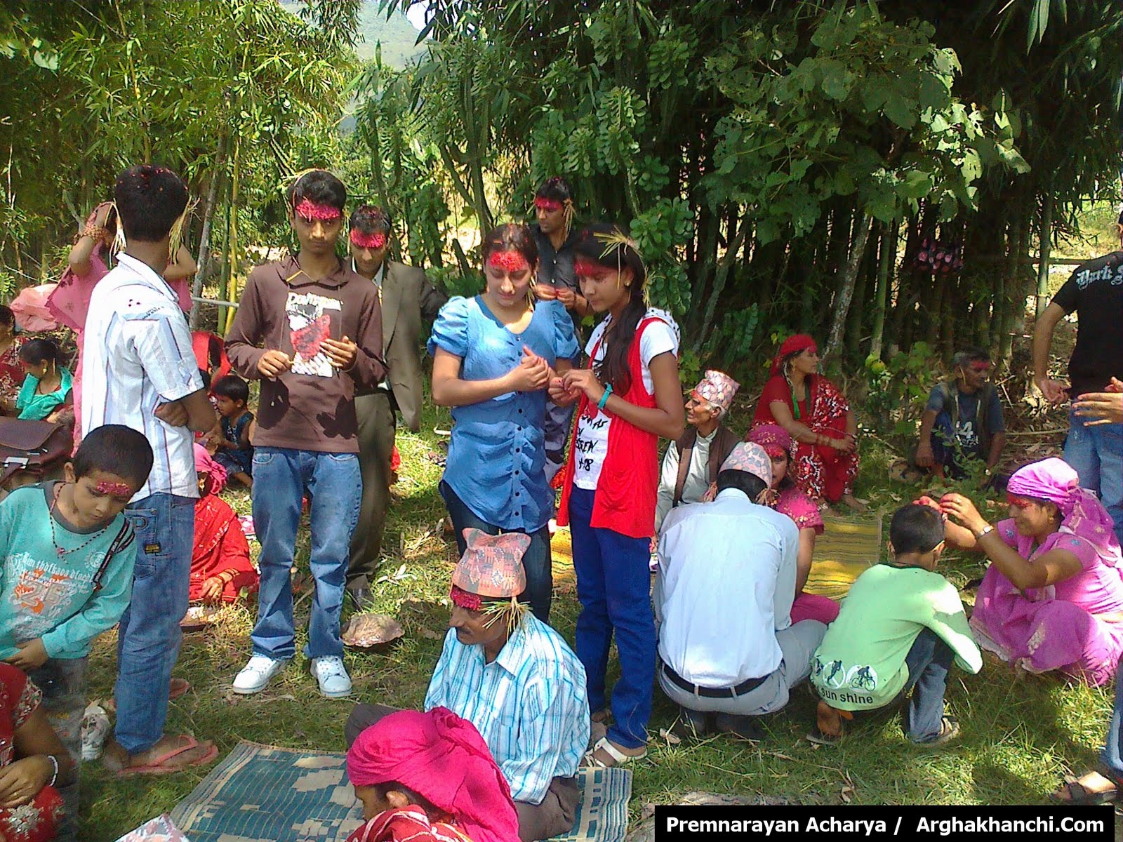 अर्घाखाँचीको एक गाउँमा सामुहिक टिका लगाउदै स्थानियहरु। हिन्दुहरुको महान चाड बडादसैँको दसौँ दिन आज अर्घाखाँचीको नगरपालिका सन्धिखर्क लगायत जिल्लाभरका सबै गाबिसहरुमा आफ्ना मान्यजनबाट टिका तथा जमरा लगाई हर्षोल्लासका साथ विजयादशमी मनाइँदैछ ।