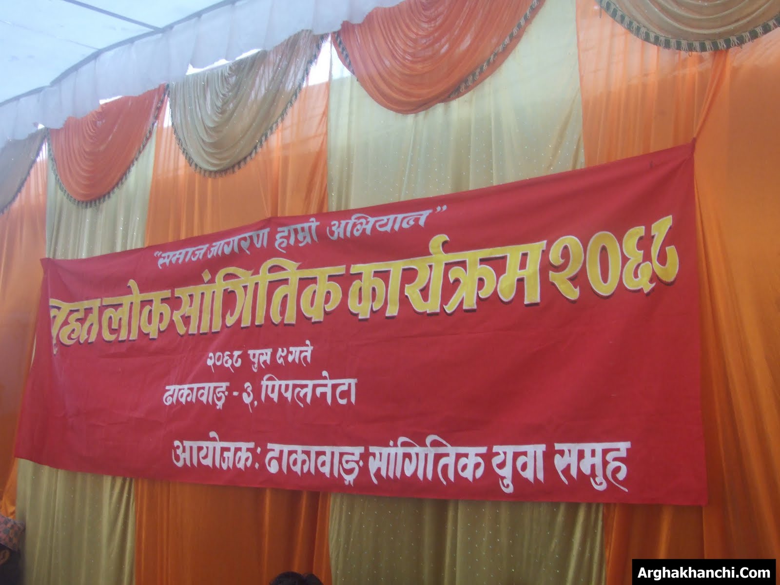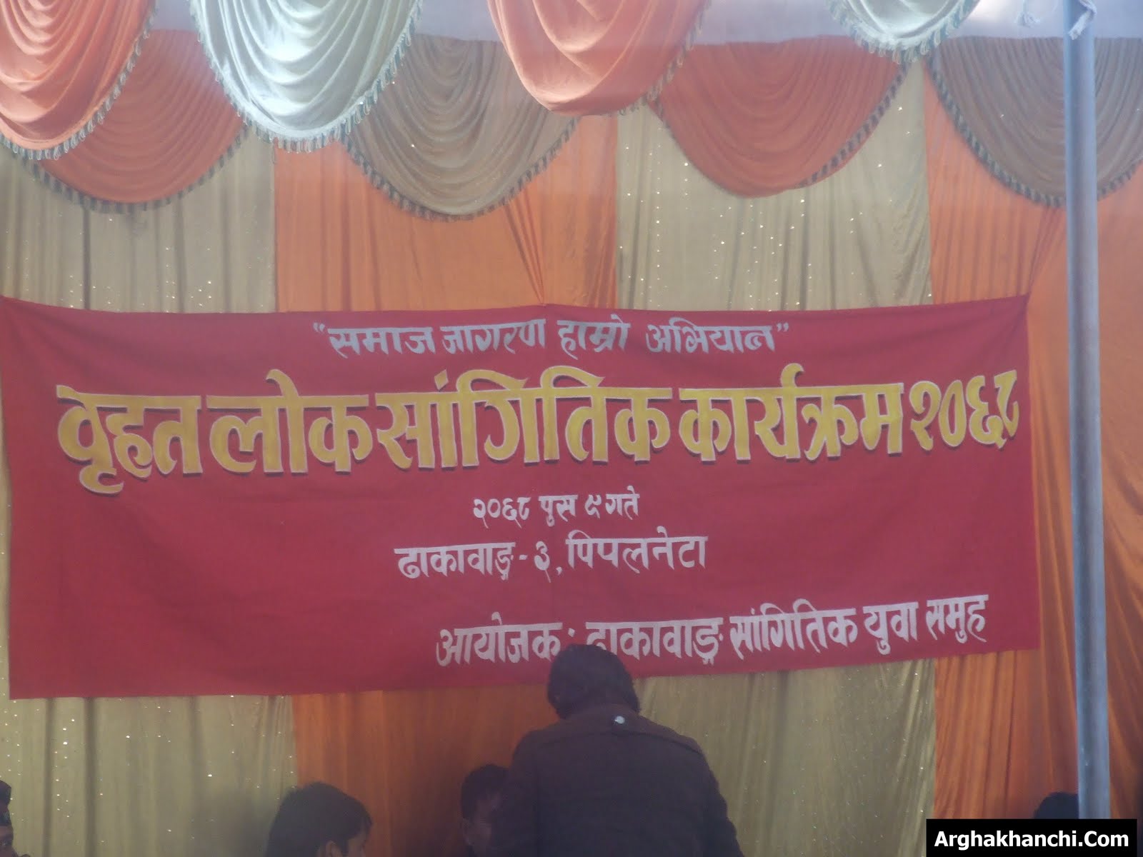 अर्घाखाँचीको ढाकाबाङ गाबिस स्थित विश्व उच्च माबि पिपल नेटामामा शनिबार भव्य सास्कृतिक कार्यक्रम सम्पन्न भएको छ । कार्यक्रमको आयोजना ढाकाबाङ साङेतिक युबा समुहले गरेको थियो । उक्त कार्यक्रममा हजारौ संगीत प्रेमी र शुभ चिन्तकहरु जमघट रहेको थियो । प्रमुख आकर्षणको रुपमा राष्ट्रिय कलाकार शर्मिला गुरुङ, सपना गाह, ईन्द्र जि सि, तुल्सी म्युजिक, हास्य कलाकार टिकाराम साहित्य, बसन्त खत्री लगायतको रहेको थियो भने प्रमुख अतिथी ईन्द्र जिसि सभापति टिकाराम खनाल र कार्यक्रम सन्चालन राम बहादुर नेपालीले गरेका थिए।