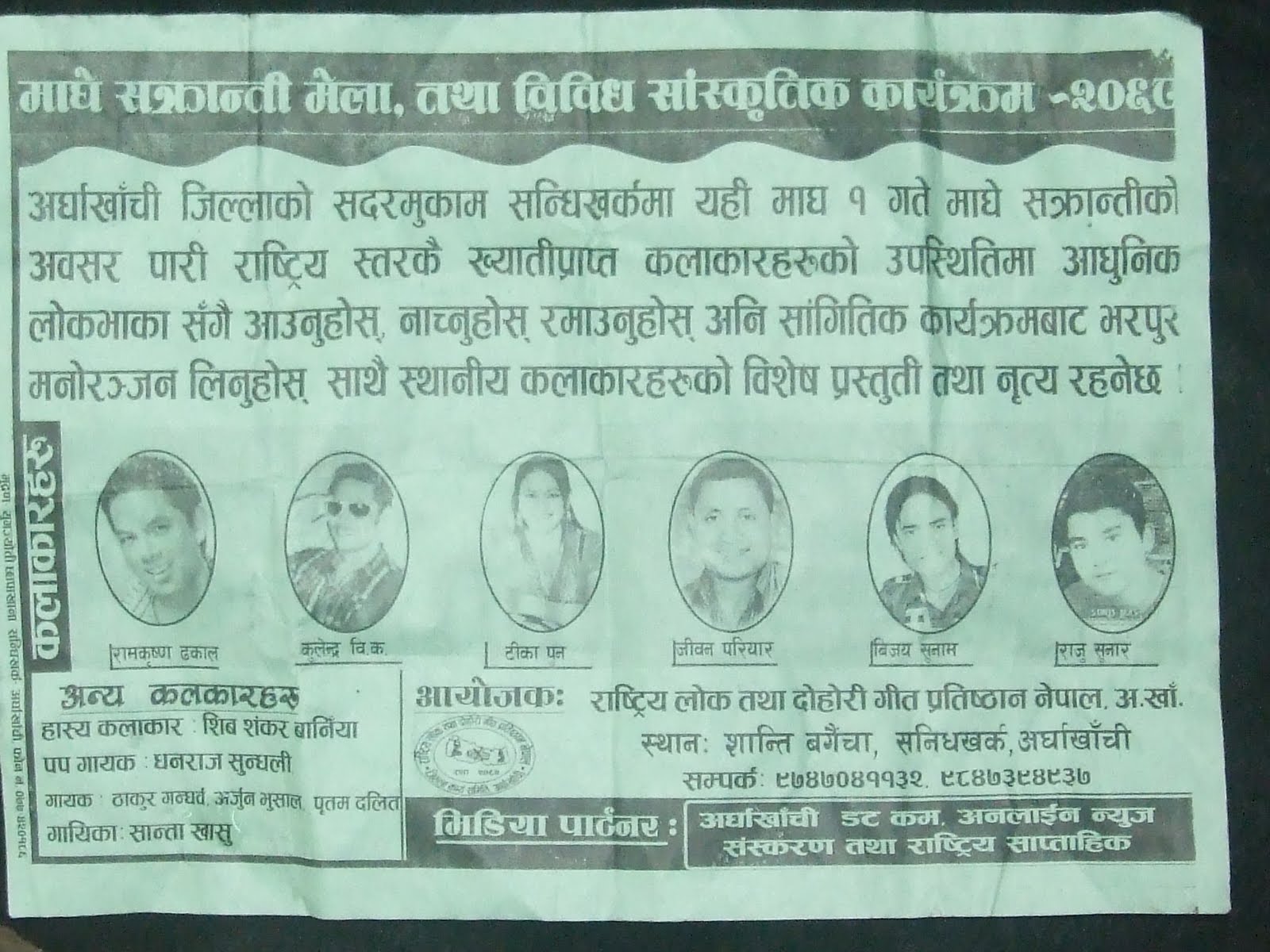 आगामी माघे सक्रान्ती अर्थात माघ १ गते अर्घाखाँची जिल्लाको सदरमुकाम सन्धिखर्कमा राष्ट्रिय स्तरको भव्य सास्कृतिक कार्यक्रम हुने भएको छ।