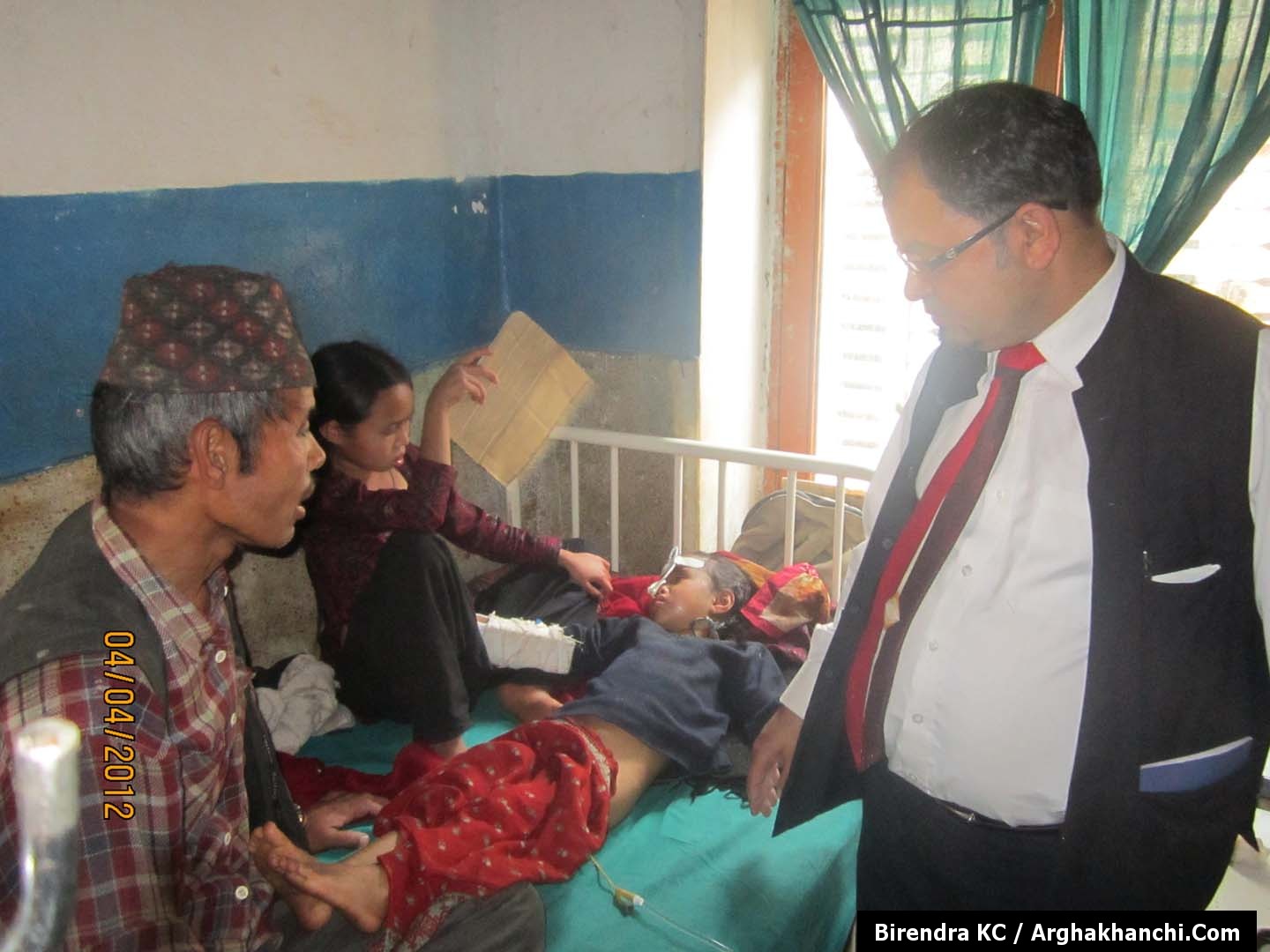गंभिर घाईते भई अर्घाखाँची जिल्ला अस्पतालको १ नम्बर वेडमा रहेकी विमला पुनको स्वास्थ्य अवस्थाको बारेमा बुझदै अस्पताल प्रमुख डा. चित्र प्रसाद शर्मा वाग्ले । साथमा उनका वुवा चन्द्र बहादुर र दिदि हेरचाह गर्दै ।