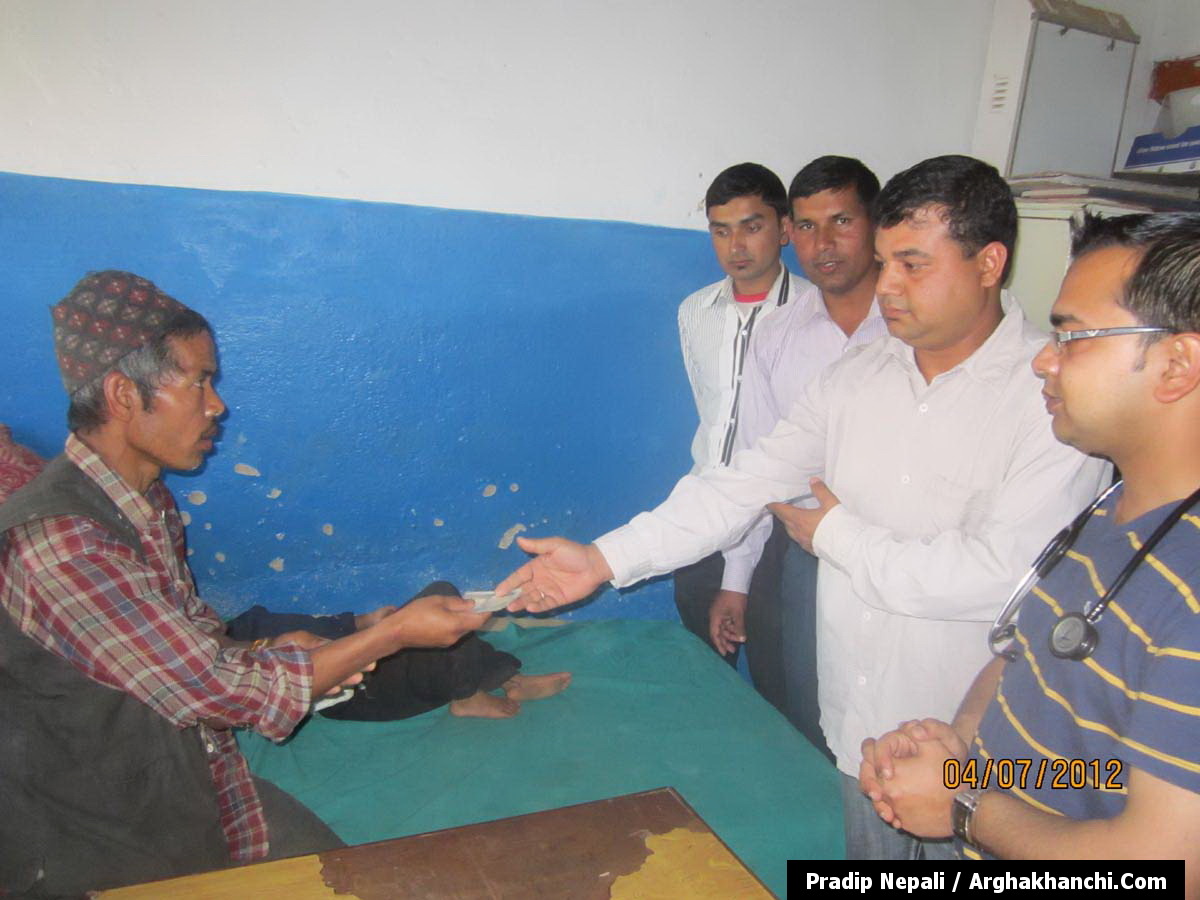 शनिवार सन्धिखर्कका युवा मदन भुसालले ५ हजार रुपैयाँ बालिकाका वुवा चन्द्र बहादुरलाई हस्तान्तरण गर्दै । साथमा अस्पतालका डा. मुनिष शर्मा अर्घाखाँची डटकमका प्रमुख मेहर सिंह केसी लगायत ।