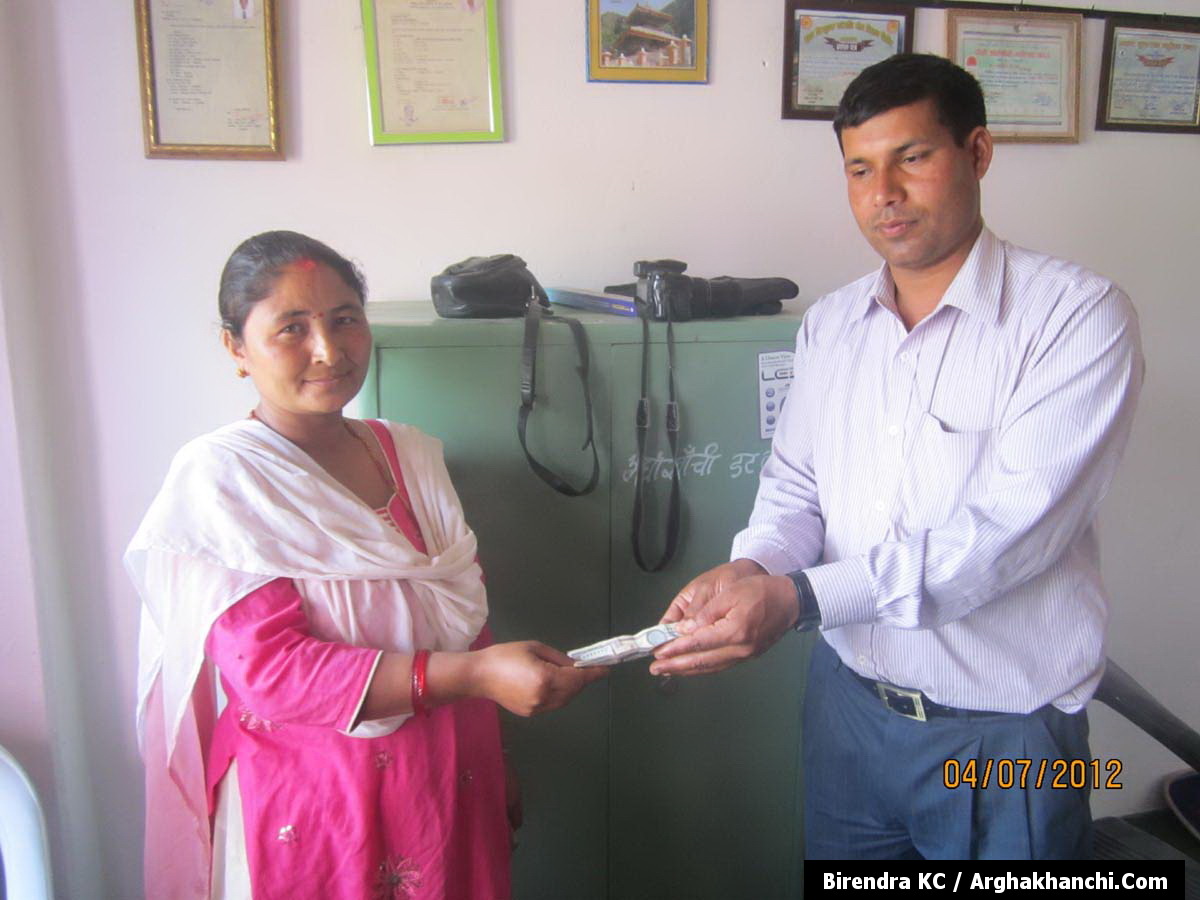 अर्घाखाँची कतार सेवा समाज अभियानको तर्फबाट २ हजार रुपैयाँ अर्घाखाँची डटकमका प्रमुख मेहर सिंह केसी मार्फत सहयोग दिदै चुत्रावेशी भक्तिटोलाकी रिता श्रेष्ठ ।