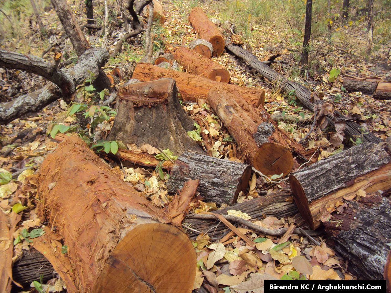 काटिए रुख- अर्घाखाँचीको सिमलपानी गाविसको कल्लेरी पौवा महिला सामुदायिक वनमा वनका पदाधिकारी कर्मचारी र तस्करको मिलेमतोमा २ सय ५० भन्दा बढी साल सिसौ असना लगायतका रुखहरु काटिएको अवस्थामा । ठुला रुखहरु वन कार्यालयको अनुमति विना चुरे क्षेत्र अन्तरगतका रुखहरु धमाधम फाँडिएका छन । महिला मात्रै पदाधिकारी रहेको वनमा यति धेरै संख्यामा रुखहरु काटिएको पहिलो पटक हो ।