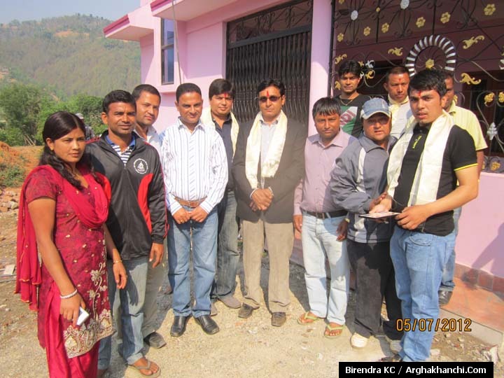 खेलकुद विकास समितिले गरेको सम्मानपछि फोटो खिचाउँदै मन्त्री सायमाझीसँगै अर्घाखाँची डटकमका सम्पादक वीरेन्द्र केसी साथमा अर्घाखाँची सिमेन्ट प्रालिका महाप्रवन्धक महेन्द्र रावल ।