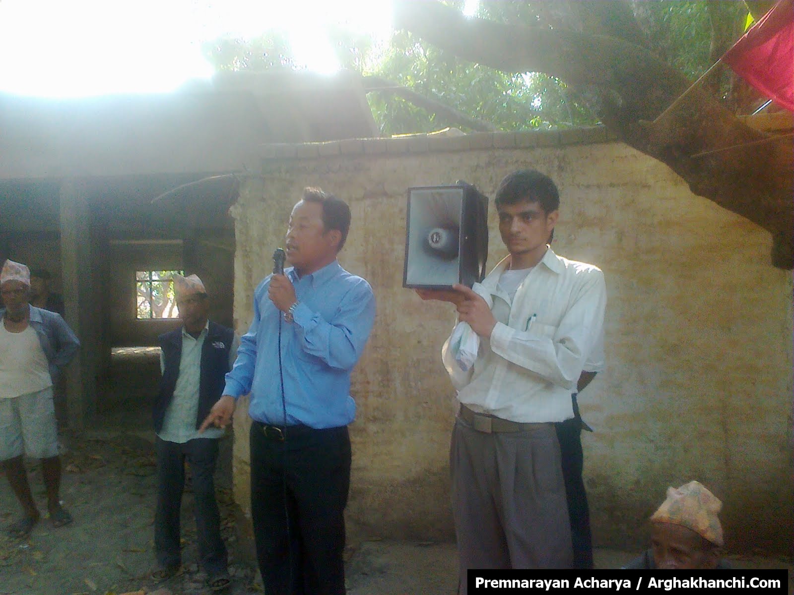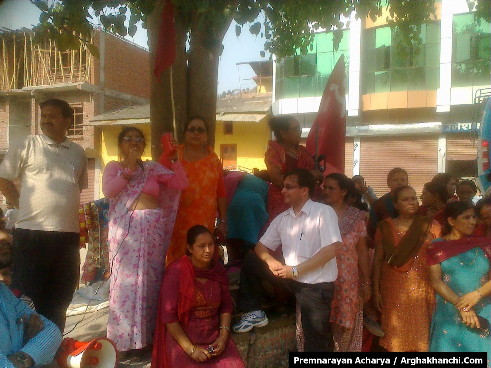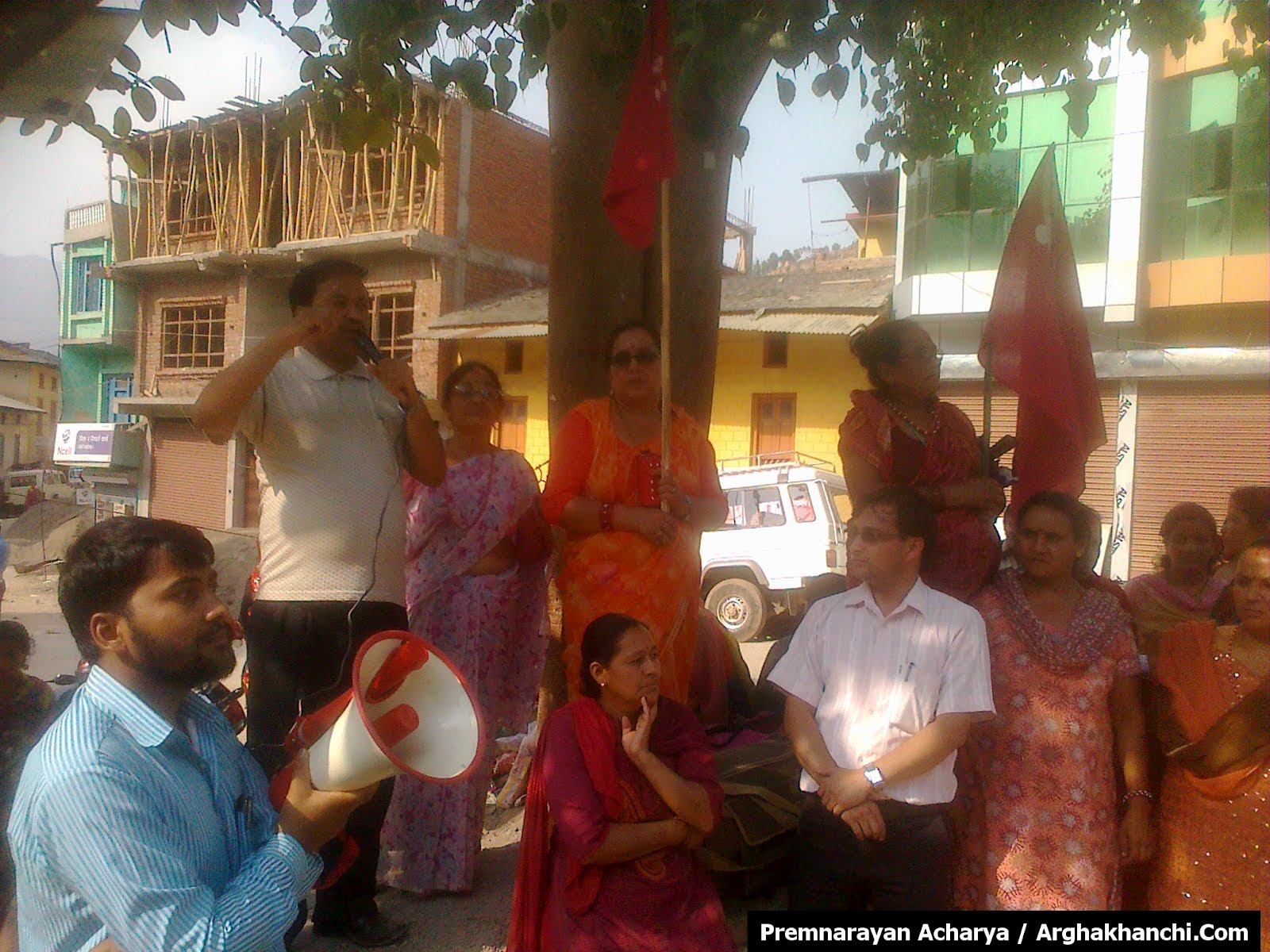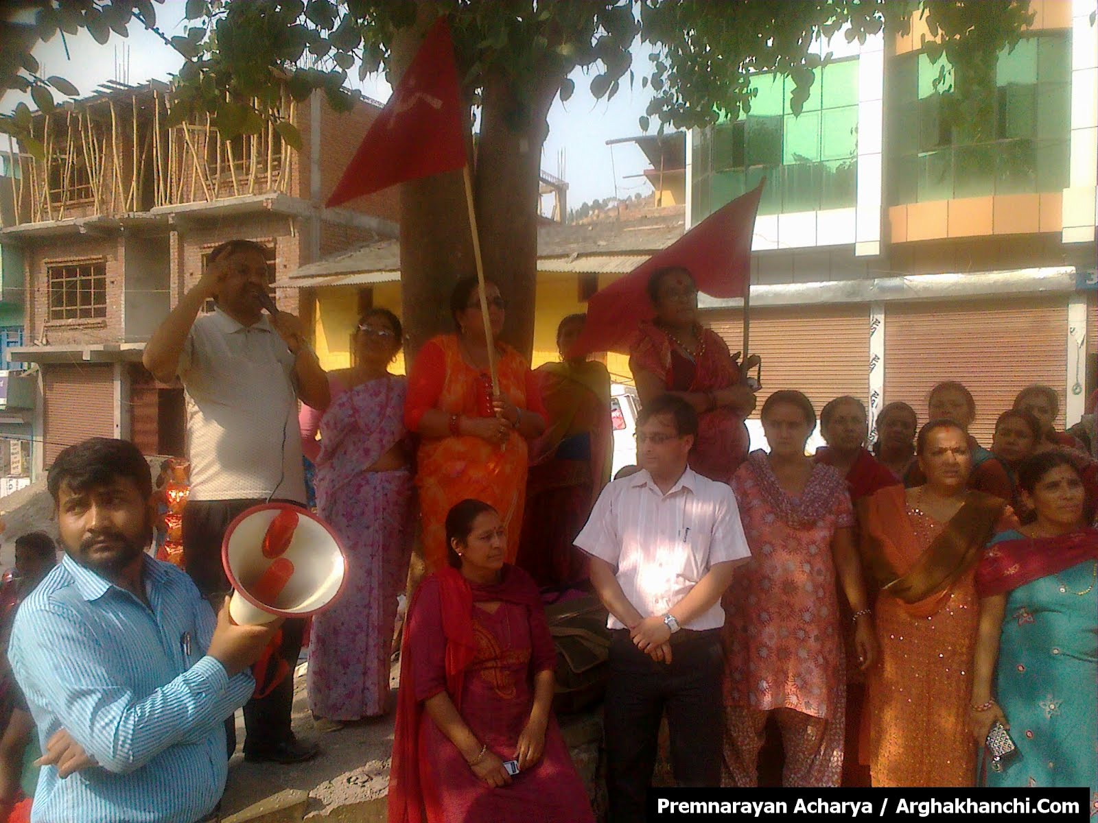 नेकपा एमालेले सन्धिर्खकको शान्ति बगैचाको सडकमा विरोध सभाको आयोजना गरेको थियो भने राष्टिय जनमोर्चाले शान्ति बगैचा भित्र विरोध सभा सम्र्पन गरेको छ ।