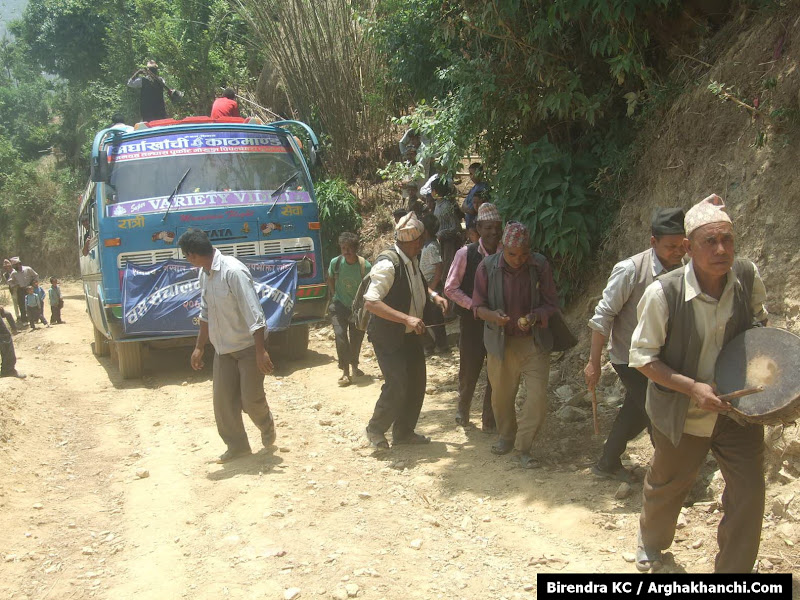 [अर्घाखाँची खन गाविसको मखातमा बस आएको खुसीयालीमा बाजा बजाएर बाच्दै गाउँले । रामपथ-मखात-खनको करिब ४ किलोमिटर कच्ची सडक निर्माण गर्न १४ वर्ष लागेको थियो]