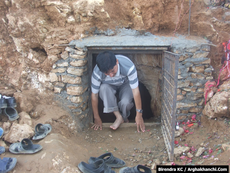 अर्घाखाँचीको डिभर्ना स्थित चोडिला गाउँमा गुफा भित्रबाट बाहिर निस्कदै स्थानीय विकास अधिकारी होमनाथ भुसाल ।