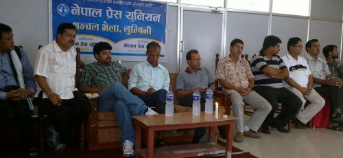 नेपाल प्रेस यूनियनका केन्द्रिय सदस्य तथा अञ्चल संयोजक रामराज पोखरेलको सभापतित्वमा भएको कार्यक्रममा यूनियनका पश्चिमाञ्चल क्षेत्रिय संयोजक रमेश पौडेल, मध्यमाञ्चल क्षेत्रिय संयोजक दीपक आचार्य,नेपाल पत्रकार महासंघका पूर्व केन्द्रीय सदस्य हरि लम्साल, पत्रकार महासंघका क्षेत्रिय संयोजक मोहन चापागाई,नेपाली कांग्रेस क्षेत्रिय सचिब काजिमान श्रेष्ठ,जिल्ला उपसभापति मनोरमा शेरचन, प्रेस यूनियन पाल्पा सभापति प्रकाश नेपाल, जर्नादन घिमिरे,रुपन्देही सभापति भवानी प्रसाद पाण्डे, लगायतले बोल्दै श्रमजिबी पत्रकार ऐन लागु गर्न कतिपय मिडियाहरु असक्षम देखिएको बताएका थिए ।