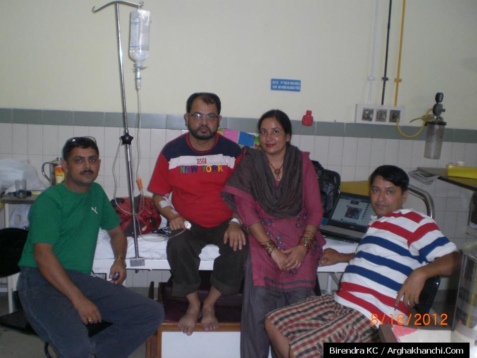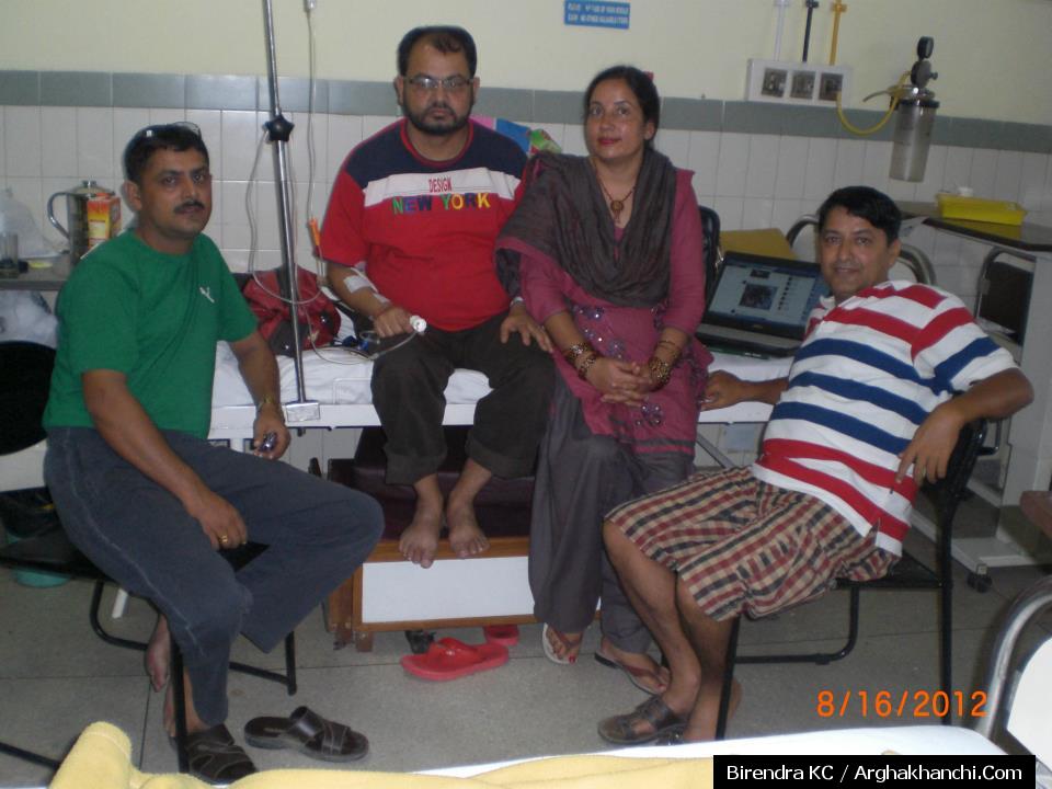 भारतको राजीवगान्धी क्यान्सर अस्पतालमा उपचार गराईरहेका डा.चित्रप्रसाद शर्मा वाग्ले साथमा उनकी श्रीमती सहित सुभचिन्तक ।