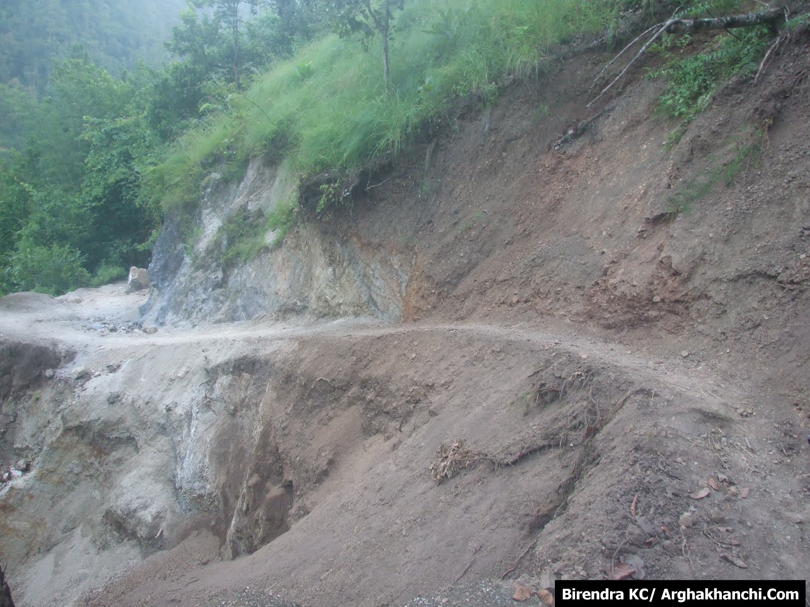 अर्घाखाँचीको धातीवाङ गाविसमा जाने वर्षाले विगि्रएको सडक । दसैमा समेत मर्मत नहुँदा सर्वसाधारण घण्टौ पैदल हिडन बाध्य भएका छन ।