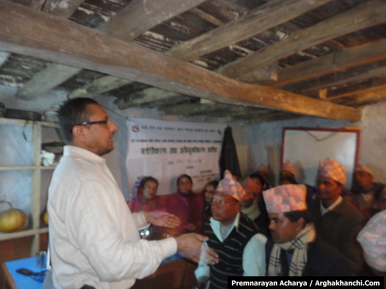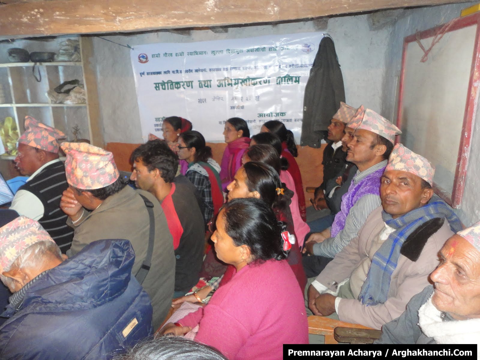 अर्घाखाँचीलाइ सन २०१४ भित्र खुल्ला दिसा मुक्त जिल्ला घोषणा गर्ने कार्यक्रम अनुसार सुरु भएको अभिमुखिकरण कार्यक्रम गाउँ स्तरिय खानेपानी तथा स्वच्छता समन्वय समितिका ३५ जनाको सहभागिता रहेको थियो ।