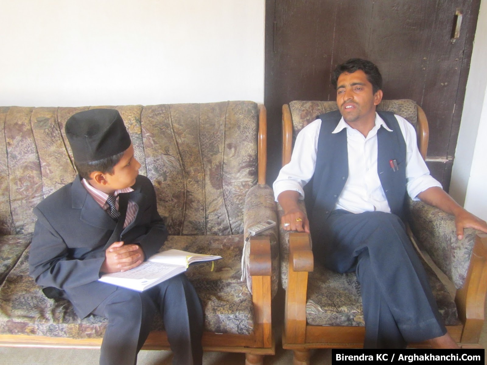 अर्घाखाँची स-प्रजिअ भेषराज खनालसँग १० वर्षीय बालक मिसन केसीले अन्तरवार्ता लिदै ।