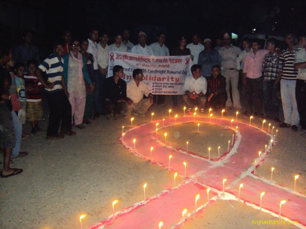 अर्घाखाँची जिल्लाको सदरमुकाम सन्धिखर्क स्थित शान्ति बगैचामा हिजो (२०७० जेठ ५ गते आईतबार) साँझ ७ बजे जिल्ला स्वास्थ्य प्रमुखले रातो रिवनको लागो माथी रहेको मैनबत्ती वाली कार्यक्रमको उद्घाटन गर्नु भएको थियो ।