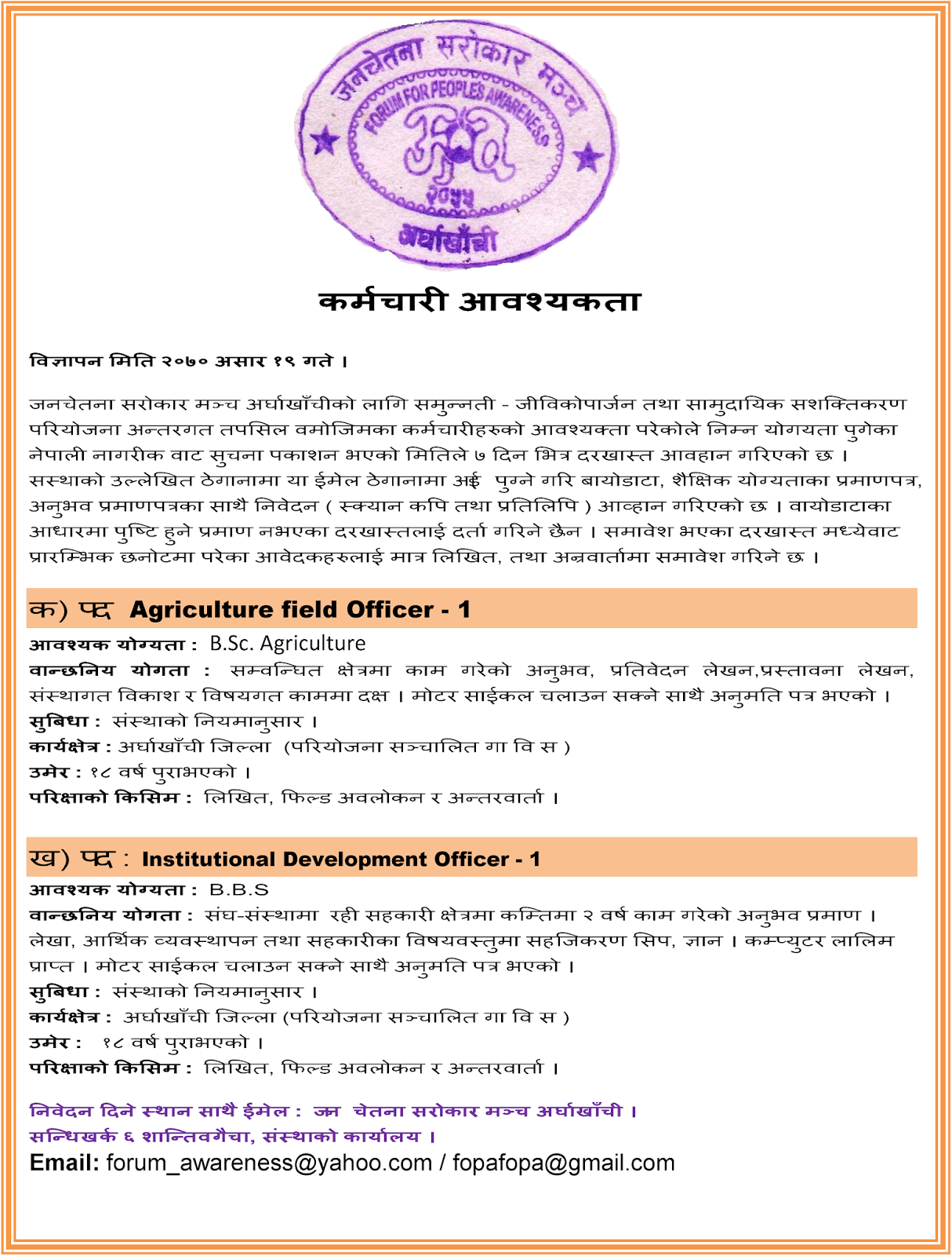 जनचेतना सरोकार मञ्च अर्घाखाँची: कर्मचारी आवश्यकता
