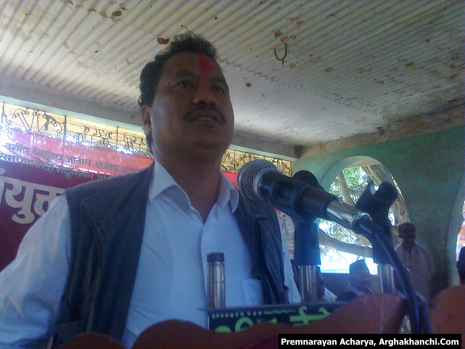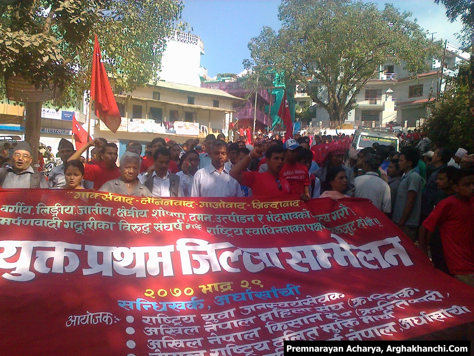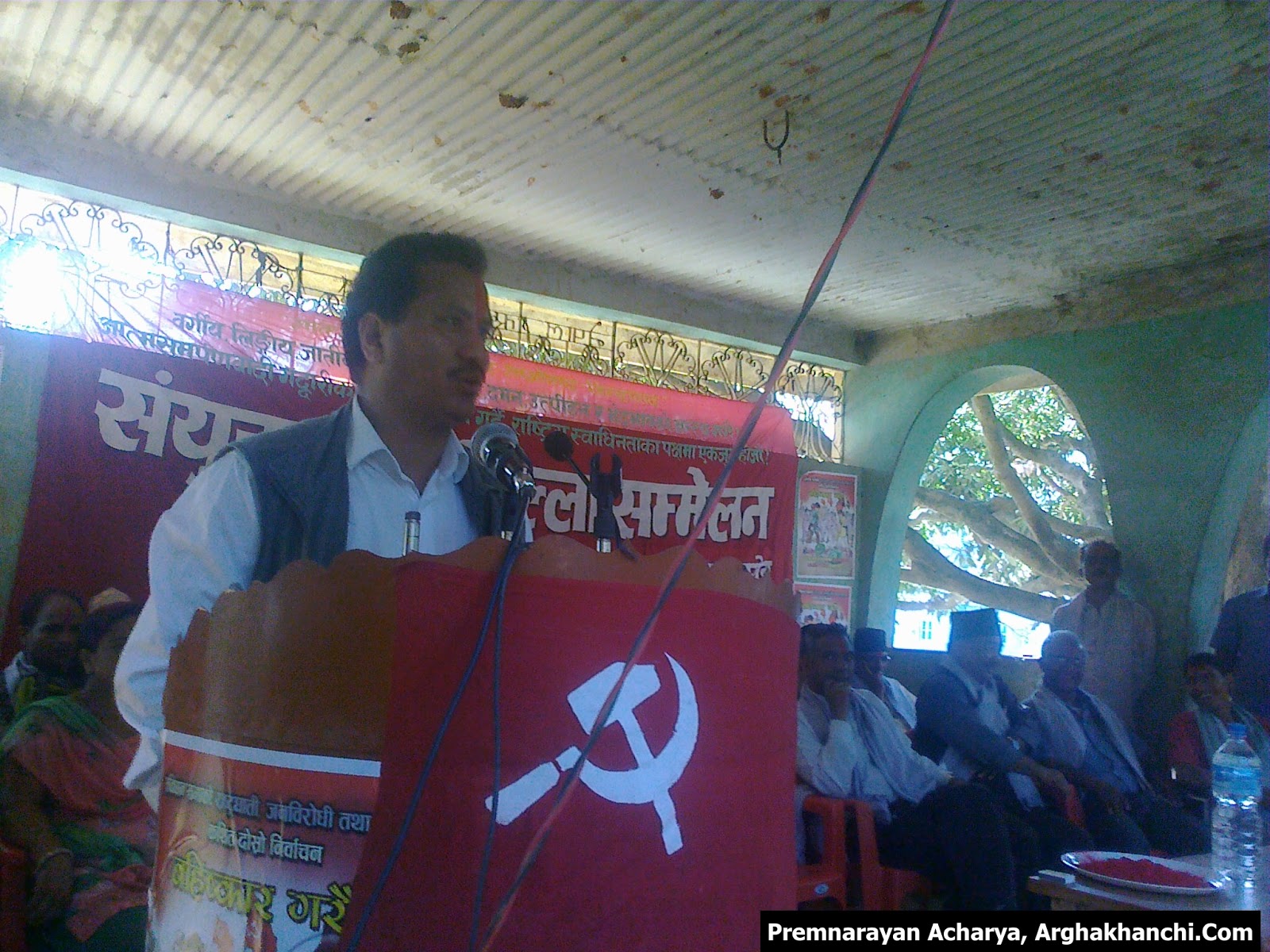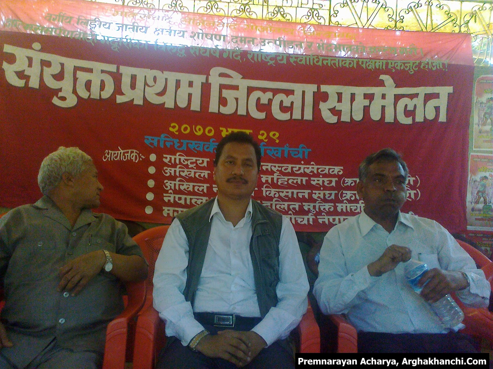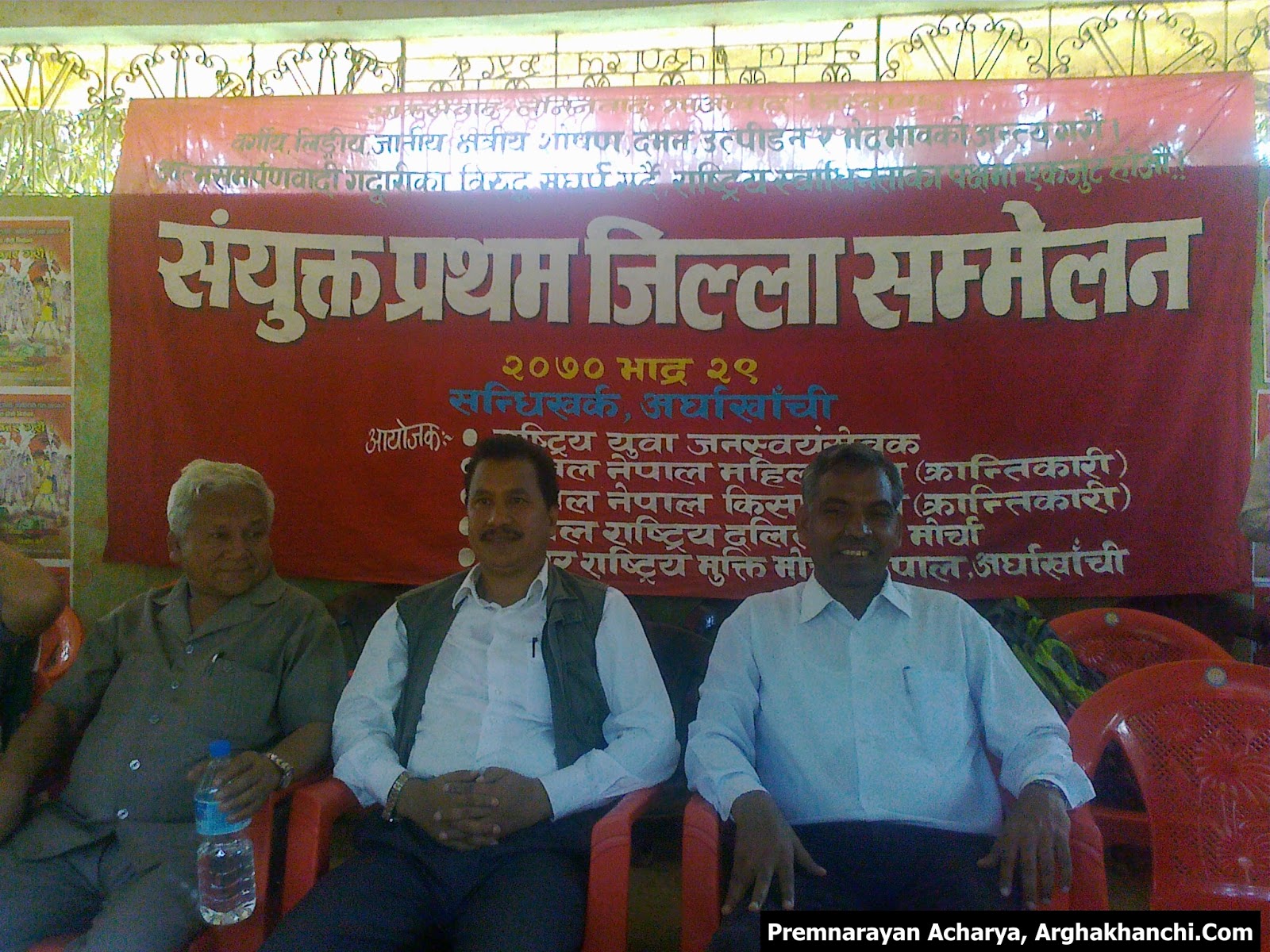 नेकपा-माओबादी निकट जनबर्गिय संगठनको संयुक्त प्रथम जिल्ला सम्मेलनलाइ सन्धिखर्कको शान्ती बगैचामा सम्बोधन गर्दै सचिब बिप्लपले यथास्थितिमा बिदेसिको इसारामा मसिर ४ गते गर्न खोजिएको संबिधान सभाको निर्बाचनका बिरुद्धमा जनताले रगत बगाएरै भए पनि निर्बाचन असफल बनाउने चेतावनी दिनु भयो ।