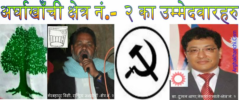 सन्धिखर्क, अर्घाखाँची । नेकपा एमालेले अर्घाखाँची जिल्लाका उम्मेदवारको टुंगो लगाएको छ। एमालेले अर्घाखाँची क्षेत्र नं.- १ मा नरेन्द्र कुमार क्षेत्री र क्षेत्र नं. २ मा डा. दुमान सिंह थापालाई आधिकारिक उम्मेदवारी पत्र दिएको हो।