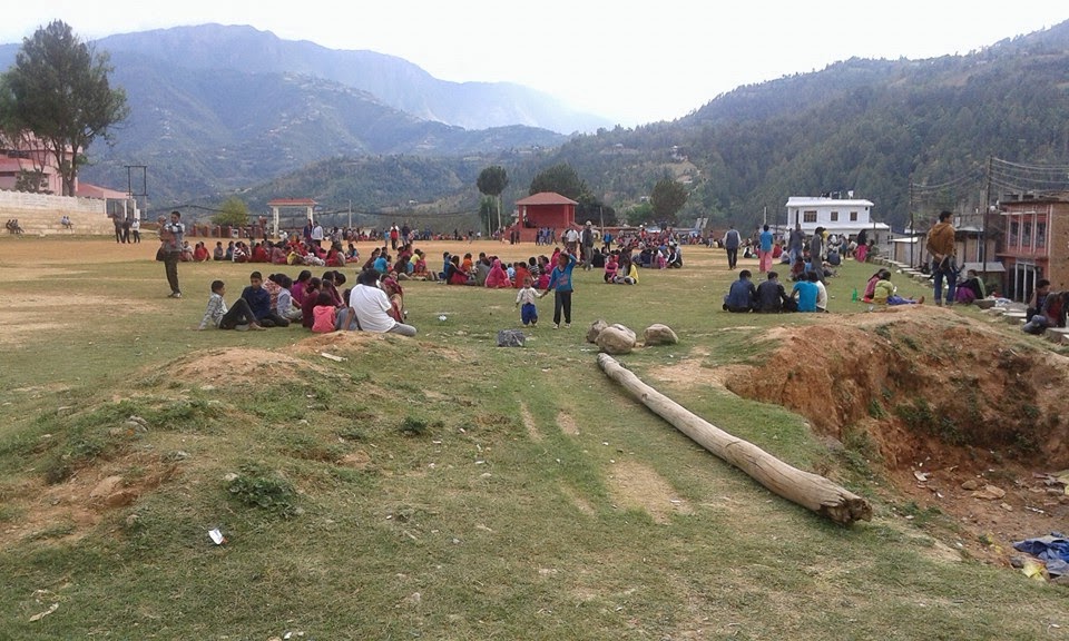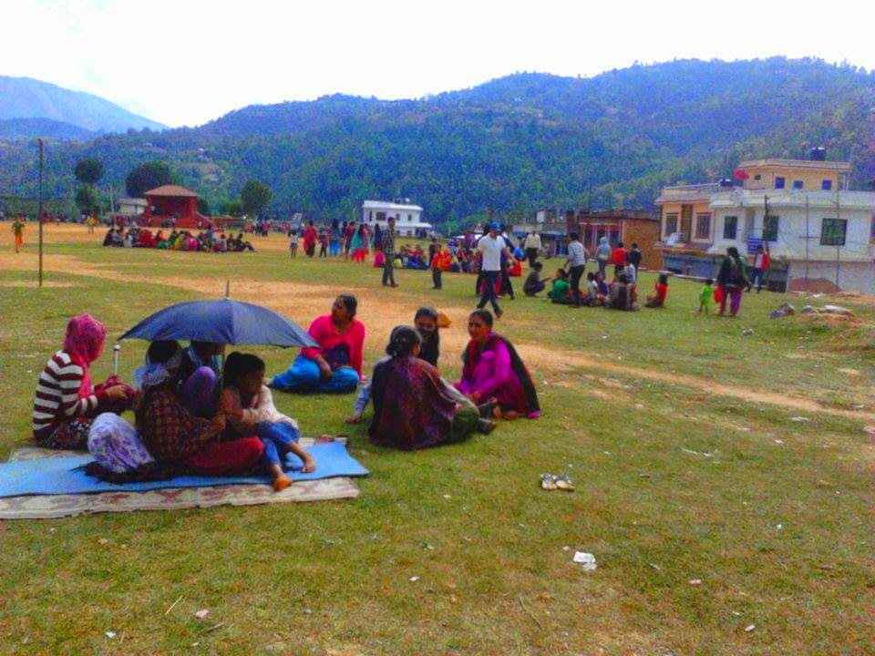 सन्धिखर्कको टुडिखेलमा निरन्तर आएको भुकम्प पछि त्रासमा बसेका मानिसहरु । तस्बिर – पुष्पा, अर्घाखाँचीडट्कम