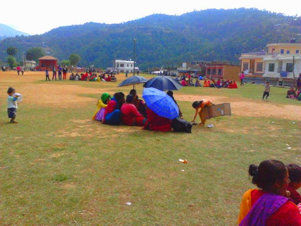 बिनासकारी महाभुकम्पमा आए सँगै सन्धिखर्कको चुत्राबेसीमा त्रासले निस्किएका स्थानियहरु । तस्बिर – फेसबूक, अर्घाखाँचीडट्कम