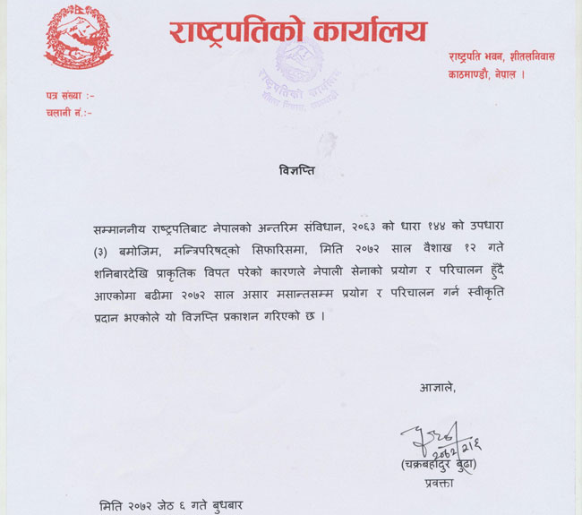 काठमाडौं । राष्ट्रपति डा. रामवरण यादवले भूकम्प प्रभावित क्षेत्रमा आगामी असार महिनासम्म सेना परिचालन गर्न स्वीकृति दिएका छन् ।
