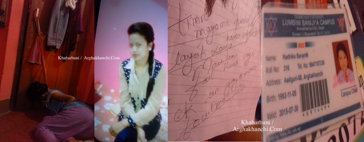 लुम्बिनी वाणिज्य क्याम्पसमा बीबीएस तेस्रो वर्षमा अध्ययन गर्दै आएकी राधाको आत्महत्या शंकास्पद देखिन्छ । ३ फिट मात्र उचाईको ढोकाको हेण्डिलमा पासो लगाएको र घुंडाले भुईंमा टेकेको तथा ढोकामा चुक्कल समेत नलगाएको अवस्थामा भएको मृत्यु शंकास्पद रहेको मृतक राधाकी मिल्ने साथी सावित्रा खनालले बताइन् ।