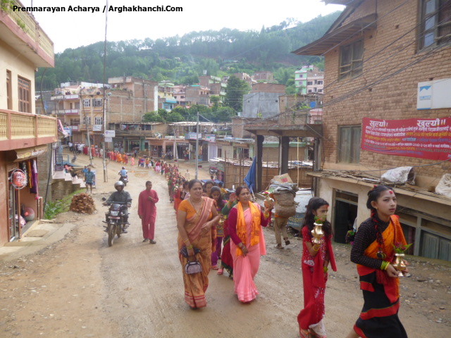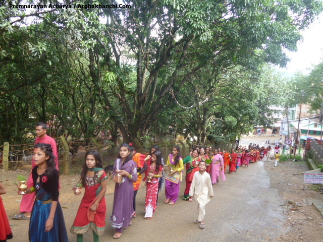 त्यस मन्दिरमा बिभिन्न तीर्थहरुको जल रहेको हुनाले त्यसबाट जल लगि बोल बम भन्दै बजारका बिभिन्न भाग परिक्रमा गरि सिद्धेश्वर सिबालय मन्दिरमा रहेको स्फटिकको शिबलिंगमा अर्पण गरिएको छ ।