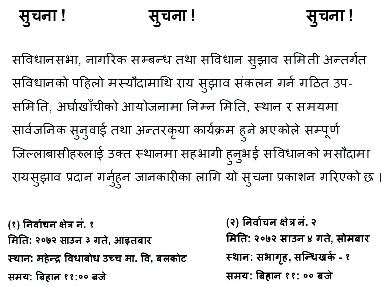 सविधानसभा, नागरिक सम्बन्ध तथा सविधान सुझाव समिती अन्तर्गत सविधानको पहिलो मस्यौदामाथि राय सुझाव संकलन गर्न गठित उप- समिति, अर्घाखाँचीको आयोजनामा निम्न मिति, स्थान र समयमा सार्वजनिक सुनुवाई तथा अन्तरकृया कार्यक्रम हुने भएकोले सम्पूर्ण जिल्लाबासीहरुलाई उक्त स्थानमा सहभागी हुनुभई सविधानको मसौदामा रायसुझाव प्रदान गर्नुहुन जानकारीका लागि यो सुचना प्रकाशन गरिएको छ ।