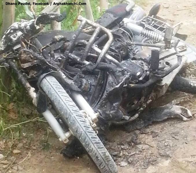 सन्धिखर्क नगरपालिका -२ को चुत्रावेसी स्थित एभरेष्ट बैकं अगाड्री पार्किङ्ग गरीराखेको २ वटा मोटरसाइकल अज्ञात समुहले मंगलबार मध्यरातमा पार्किङ्ग गरेको ठाउँदेख्री झण्डै ५० मिटर टाढा लगि जलाईदिएको हो ।