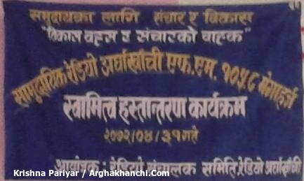 सन्धिखर्क, अर्घाखाँची । अर्घाखाँचीको सन्धिखर्कमा समुदायका लागी संचार र विकासद्धारा संचालित सामुदायिक रेडियो अर्घाखाँचीको आज एक कार्यक्रमका बिच स्वामित्व हस्तान्तरण गरिएको छ ।
