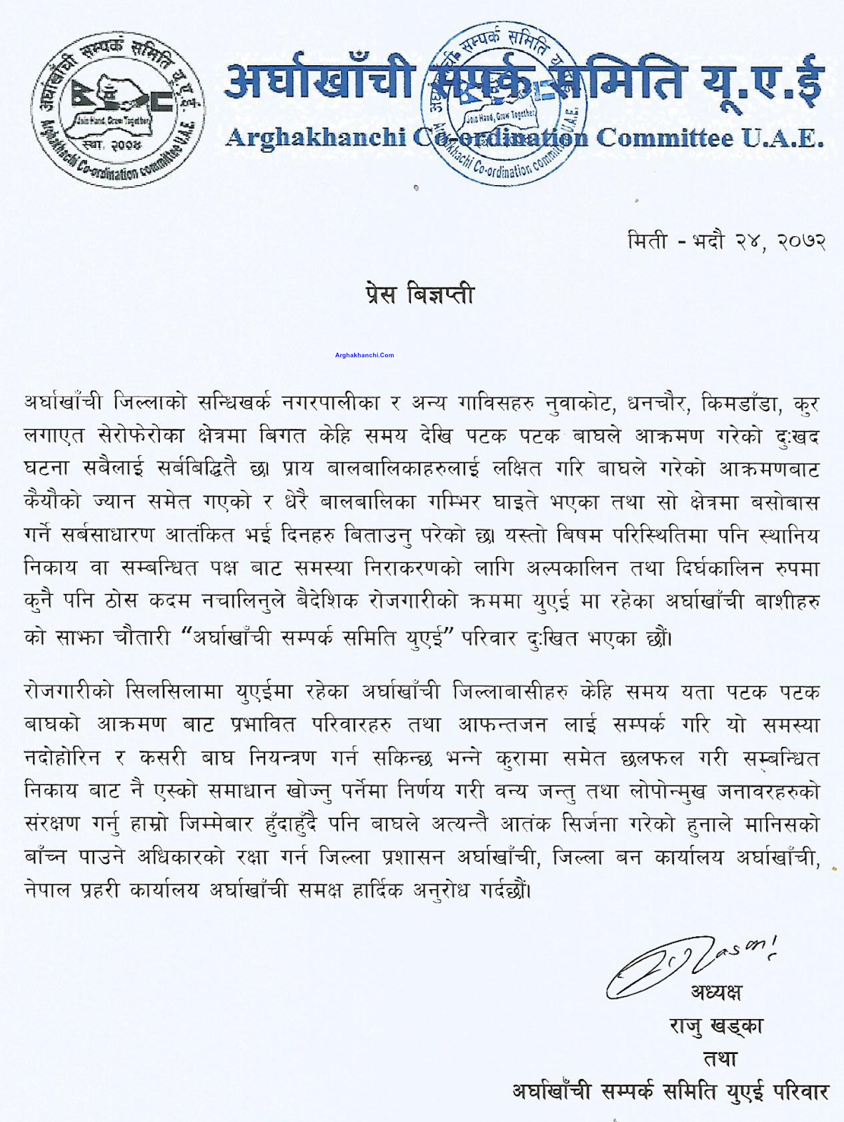 अर्घाखाँची सम्पर्क समिति युएईका अध्यक्ष राजु खड्काले जारी गरेको प्रेस विज्ञप्तीमा भनिएको छ,:- प्राय बालबालिकाहरुलाई लक्षित गरि बाघले गरेको आक्रमणबाट कैयौको ज्यान समेत गएको र धेरै बालबालिका गम्भिर घाइते भएका तथा सो क्षेत्रमा बसोबास गर्ने सर्बसाधारण आतंकित भई दिनहरु बिताउनु परेको छ। यस्तो बिषम परिस्थितिमा पनि स्थानिय निकाय वा सम्बन्धित पक्ष बाट समस्या निराकरणको लागि अल्पकालिन तथा दिर्घकालिन रुपमा कुनै पनि ठोस कदम नचालिनुले बैदेशिक रोजगारीको क्रममा युएई मा रहेका अर्घाखाँचीबासीहरुको साझा चौतारी अर्घाखाँची सम्पर्क समिति युएई परिवार दुःखित भएका छौं।