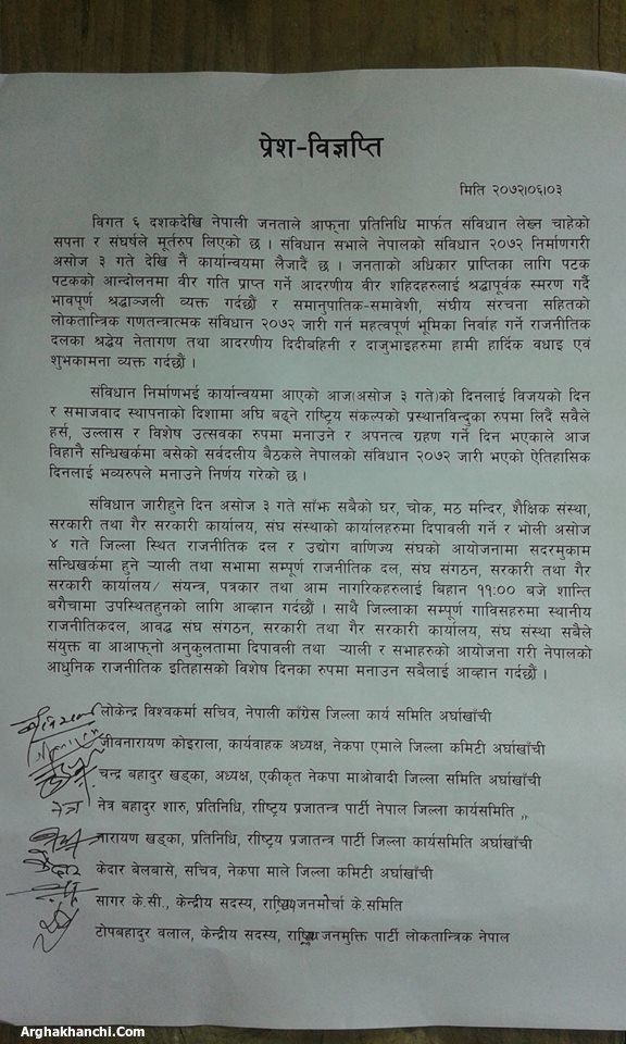 संविधानको स्वागत कार्यक्रममा सम्पूर्ण जिल्लाबासीहरुलाई सहभागी हुन अर्घाखाँची उद्योग वाणिज्य संघले आमन्त्रण गरेको छ ।