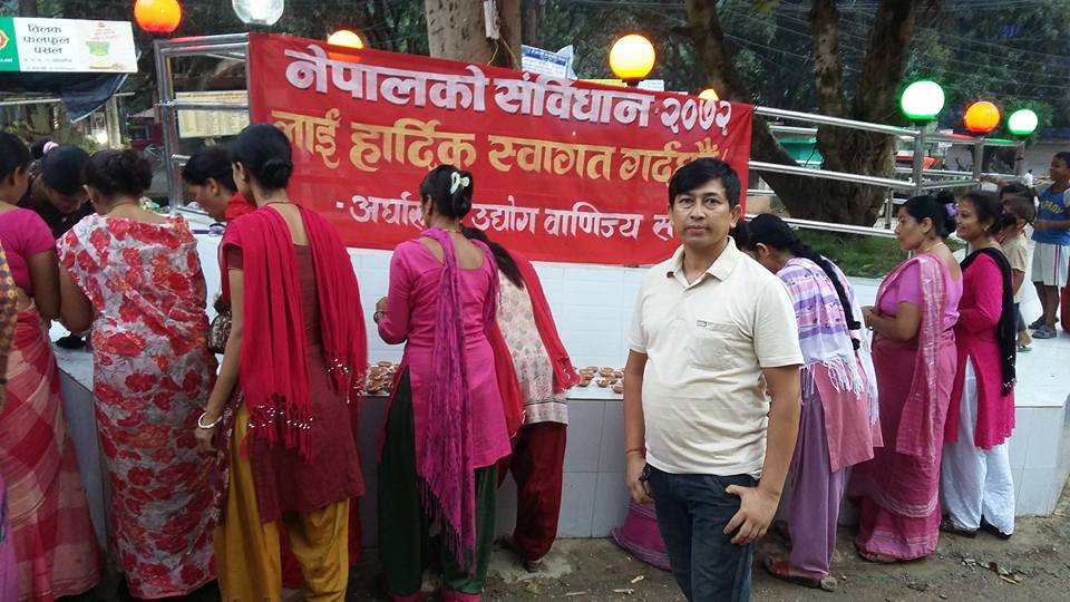 काठमाडौंको नयाँ बानेश्वरस्थित संविधानसभा भवनबाट राष्ट्रपति डा.रामवरण यादवले आईताबार साँझ नयाँ संविधानको घोषणा गर्ने बित्तिकै सन्धिखर्कका मुख्य चोकमा विभिन्न राजनीतिक दल, सरकारी निकाय, गैरसरकारी निकाय, सङ्घ-संस्था, अस्पतालहरु तथा सर्वसाधारणले भव्यरुपमा दिपावली गरी संविधान आएकोमा खुशीयाली मनाएका छन् ।