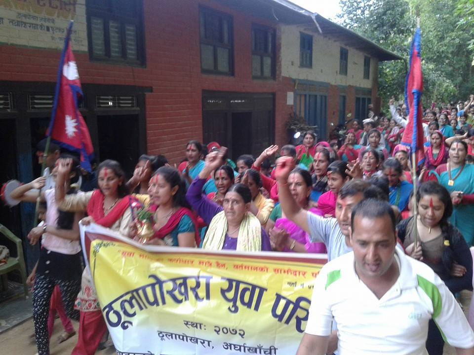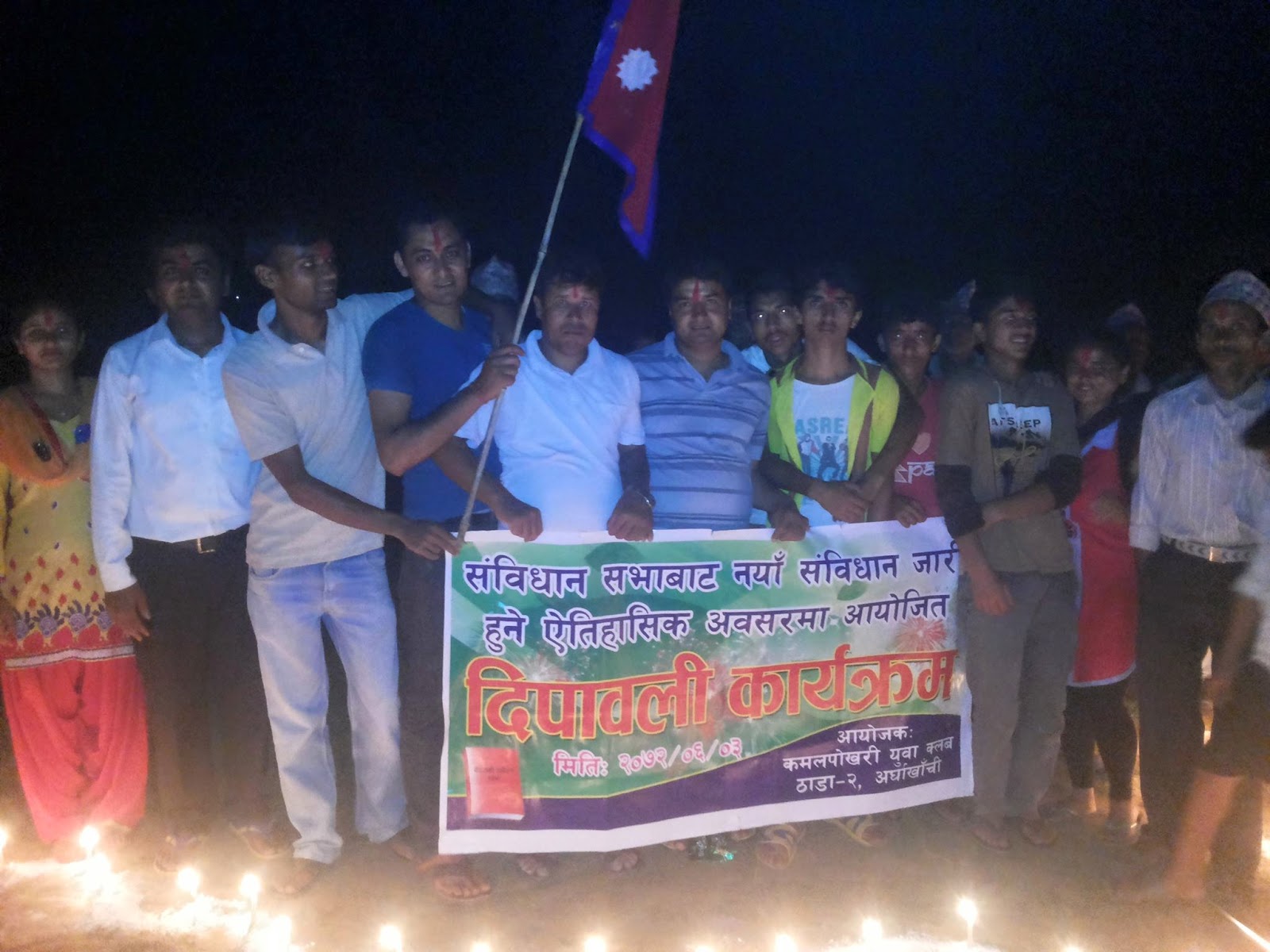 सन्धिखर्क बजार र चुत्राबेशी बजारमा नयाँ संविधान आएकोमा खुशी व्यक्त गर्दै द्वीप प्रज्ज्वलन गरी स्वागत गरेका छन् । यस्तै जिल्लाका गाउँ – गाउँमा पनि द्वीप प्रज्ज्वलन गरी स्वागत गर्नुका साथै दिपावली गरी हर्ष उल्लाससहित खुशीयाली मनाएका छन् ।