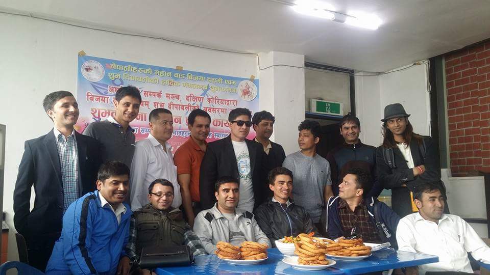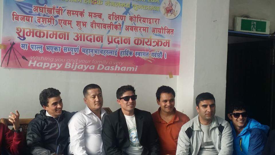 दशै तिहारको सम्झनामा अर्घाखाँचीबाट रोजगारीको लागि दक्षिण कोरिया गएका युबाहरुको एक मात्र सस्था अर्घाखाँची कोरिया सम्पर्क मञ्चले कोरियामा आईतबार दशै तिहारको शुभकामना आदान प्रदान र भेटघाट कार्यक्रमको आयोजना गरेको थियो ।