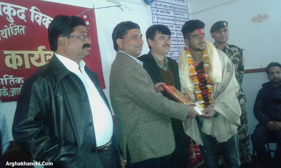 पश्चिम नेपालको पहाडी जिल्ला अर्घाखाँचीको खन गा.वि.स.मा जन्मिएर नेपाललाई खेलको माध्यमबाट अन्तराष्ट्रिय जगतमा चिनाउने अभियानमा लागेका अण्डर नाइन्टीन क्रिकेट खेलाडी शौरभ खनाललाई सम्मान गर्न आयोजना गरिएको कार्यक्रमबाट सम्मानित भएपछि संक्षिप्त मन्तव्य राख्दै खेलाडी शौरभ खनालले आफु आफ्नो जिल्लामा राष्ट्रिय खेलाडी भएर आउँदा जिल्ला खेलकुद विकास समितिले आयोजना गरेको कार्यक्रमबाट पहिलो पटक सम्मानित हुन पाउँदा खेलमा अगाडी बढ्न थप प्रेरणा मिलेको बताउनुभएको छ ।