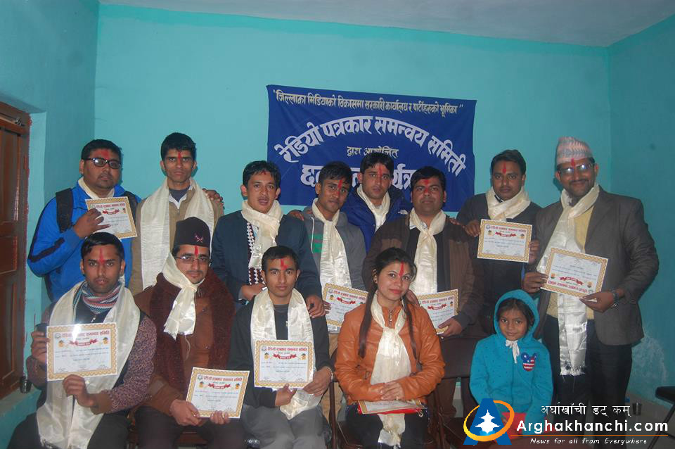 रेडियो पत्रकार समन्वय समितिका अध्यक्ष हृदय कुमार भुसालको अध्यक्षता ,बरिष्ठ उपाध्यक्ष श्याम प्र्रसाद घिमिरेको स्वागत मन्तव्य र महा-सचिव हरी प्रसाद भुसालको संचालनमा सम्पन्न भएको कार्यक्रमका प्रमुख अतिथि प्रमुख जिल्ला अधिकारी सुरेन्द्र पौडेलले रेडियो पत्रकार समन्वय समितिमा निर्बाचित पदाधिकारीहरुलाई प्रमाणपत्र सहित सम्मान गर्नुभएको थियो ।