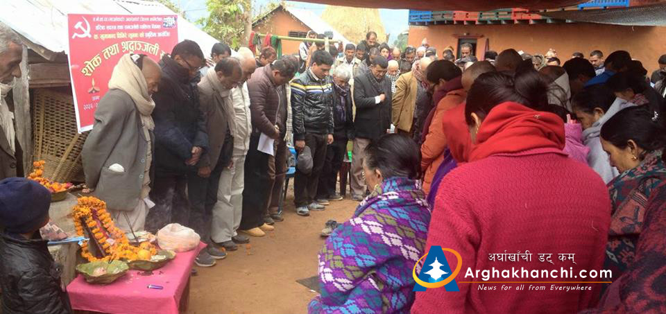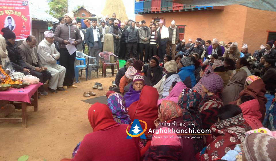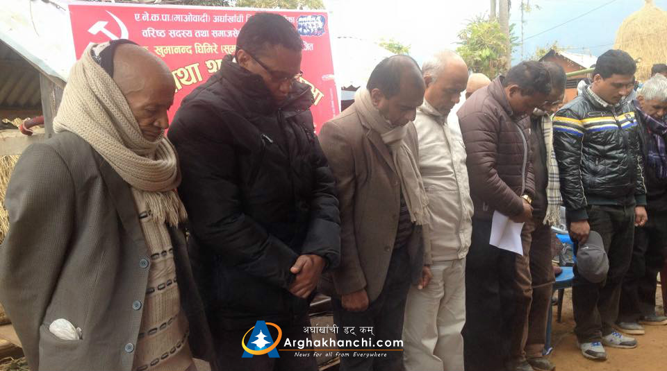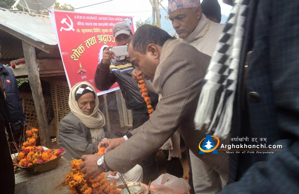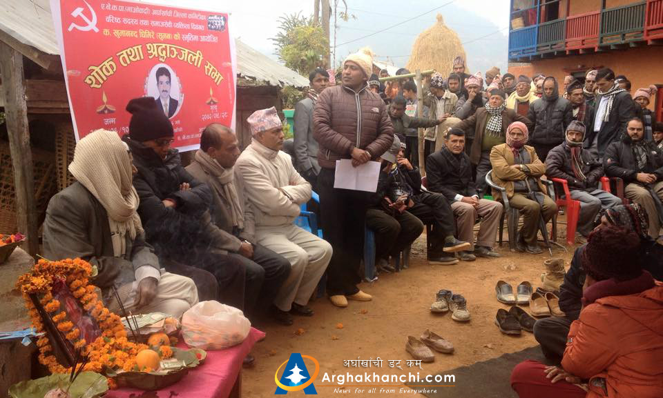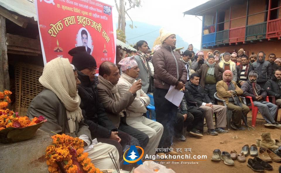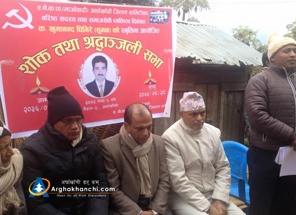 मैदान- ३ स्थाई निवासी पुर्व माओवादी जनमुक्ती सेनाका कम्पनी कमाण्डर हाल एकिकृत माओवादी जिल्ला कमिटी अर्घाखाँचीका जिल्ला कमिटी सदस्य एवं मैदान विद्युत उपभोक्ता समितीका अध्यक्ष खुमानन्द घिमिरे सुमनको दुवै मृर्गौला खराव भई काठमाण्डौ स्थित शिक्षण अस्पतालमा उपचारकै क्रममा निधन भएको नोवौँ दिनको अवसरमा एकिकृत माओवादी जिल्ला कमिटी अर्घाखाँचीले सुमनको घरमा सोकसभा सम्पन्न गरेको हो ।