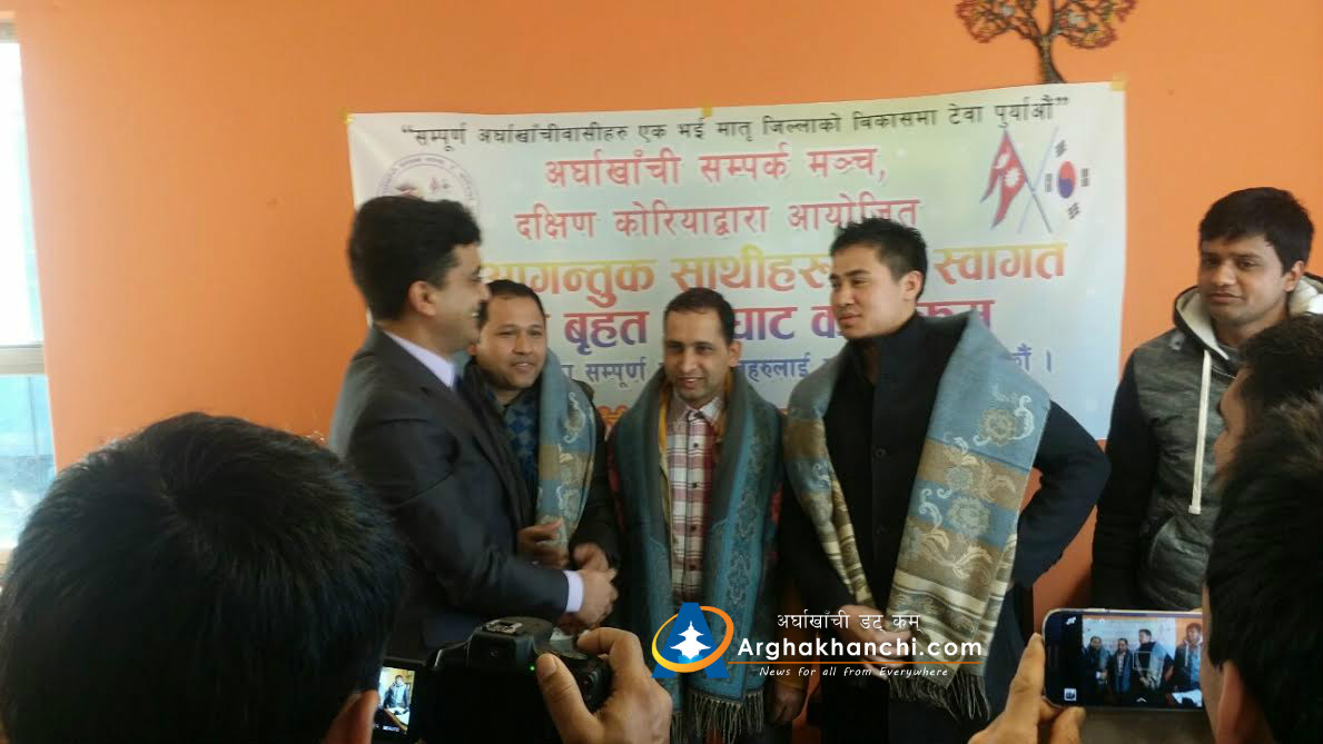 कोरियामा नेपालीहरुको संख्या तिब्र बढदै गर्दा अर्घाखाँचीबाट कोरिया आउनेको संख्यापनि बाक्लो बनेको छ ।कोरियाको  नेपाली मार्केट भनेर चिनिने दोन्देमुन शहरको होटेल नमस्ते अर्घाखाँची बासिले खचाखच थियो यहि फेब्रुअरी ७ तारिकका दिन ।लामो समय पछिको भेट्घाट आपसी सुख दुख अनि परदेशको भोगाई आफ्नै जिल्लाका साथिसामु बाँड्न पाउँदा सबैको अनुहारमा दसैं  र तिहार आएजस्तो खुसिको अनुभव गर्न सकिन्थ्यो ।