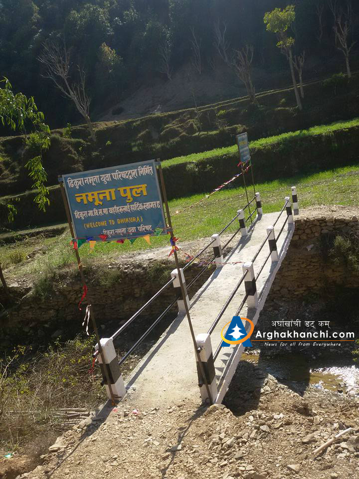 गच्छेखोला बजार, अर्घाखाँची । ढिकुरा नमुना युवा परिसदको पहलमा सन्धिखर्क नगरपालिका – ९ प्रगतिनगर मुनी – ढिकुराको बिचमा पर्ने टिमुरेखोलामा निर्माण गरिएको पुल आज सर्बसाधारणको प्रयोगको लागि उद्घाटन कार्यक्रम गरि खुला गरिएको छ ।
