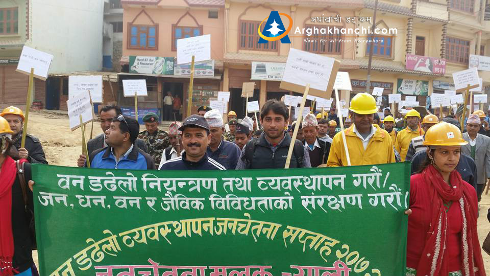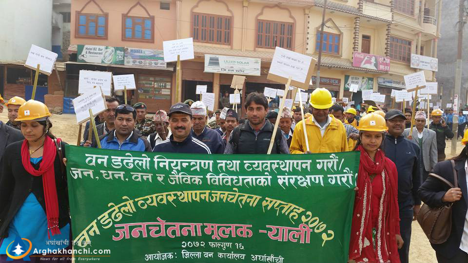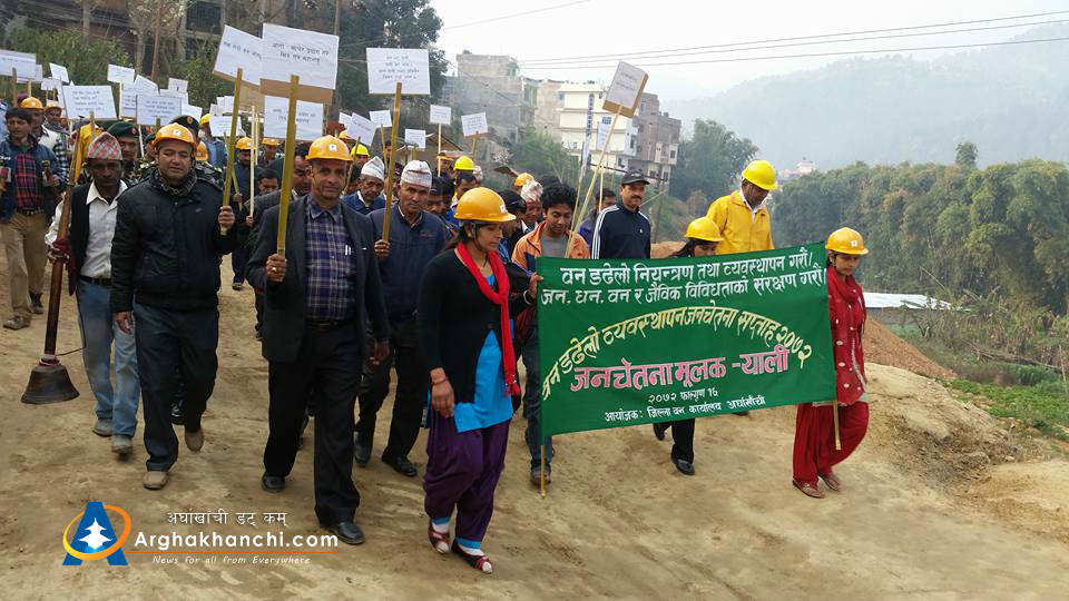 जिल्ला वन कार्यालय अर्घाखाँचीले आयोजना गरेको वन डढेलाे व्यवस्थापन जनचेतना सप्ताह -र्यालीमा जिल्लाका विभिन्न संघसस्था, सरकारी कार्यालय प्रमुखहरु, पत्रकार लगायतको सहभागीता रहेको थियो ।