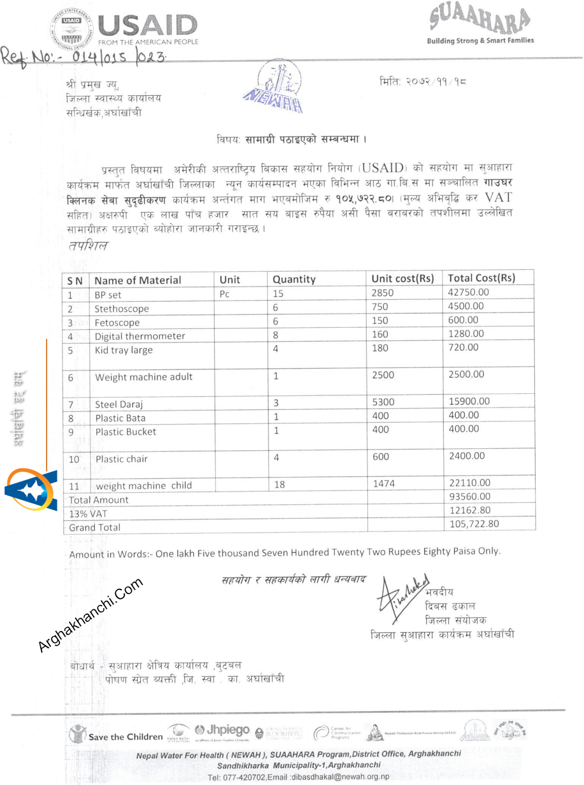 USAID को आर्थिक सहयोग एवम सुआहारा कार्यक्रमबाट जिल्ला स्वास्थ्य कार्यालय मार्फत १ लाख पाँच हजार रूपैंयाँ बराबरको स्वास्थ्य सामग्री हस्तान्तरण गरिएको हो ।