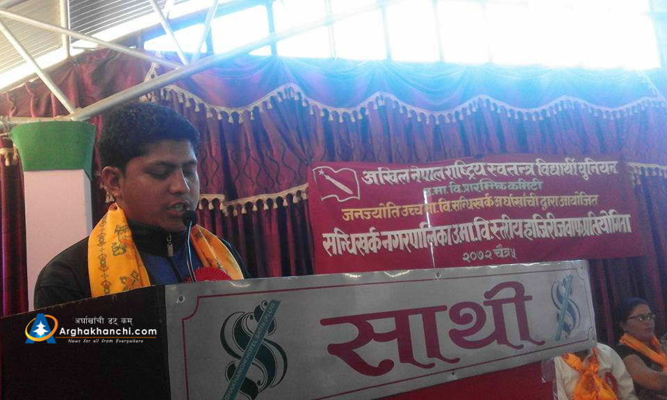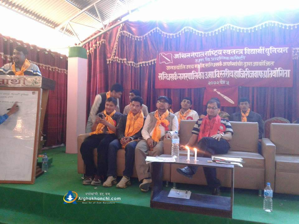 सन्धिखर्क, अर्घाखाँची । अनेरास्ववियु जनज्योति उच्च मावि प्रारम्भिक कमिटीले सन्धिखर्क नगरपालिका उच्च मावि स्तरीय हाजिरी जवाफ प्रतियोगिता सम्पन्न भएको छ। प्रतियोगितामा युवा वर्ष जनता रविचित्र उच्च मावि प्रथम, जनज्योति उच्च मावि चुत्रावेशी द्वितिय र पाणिनि वहुमुखी क्याम्पस सन्धिखर्क तृतिय भएका छन् ।