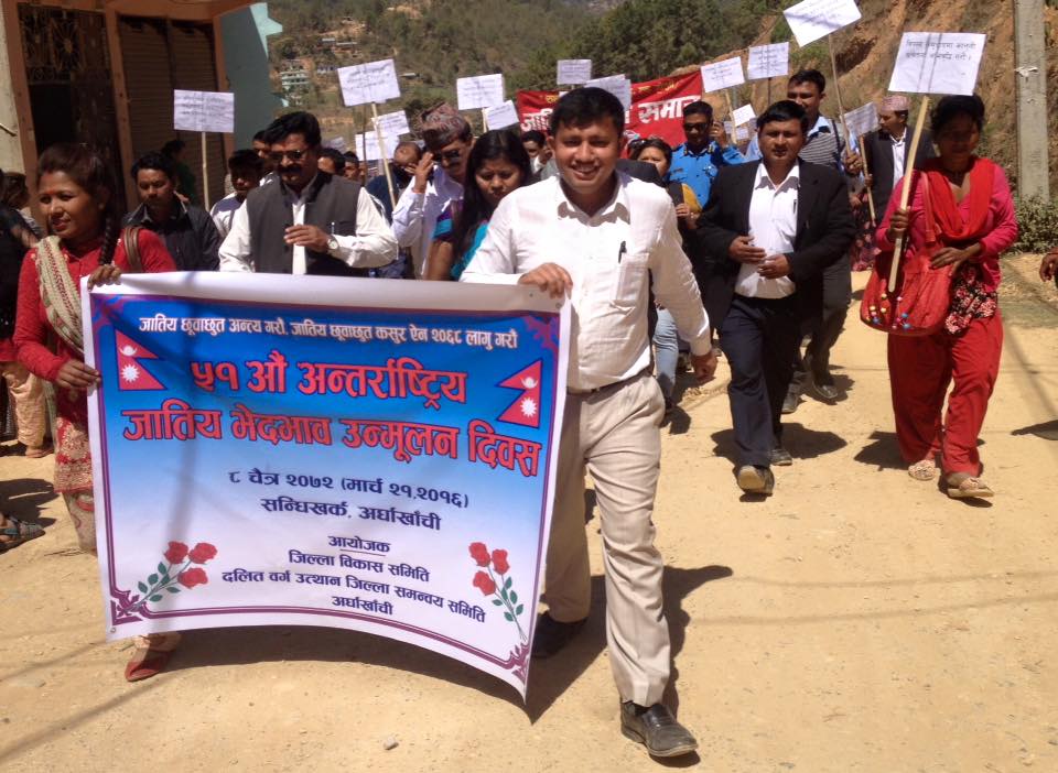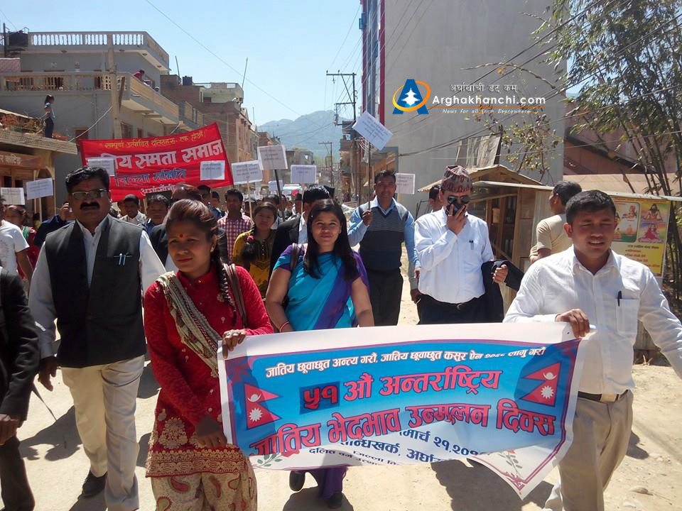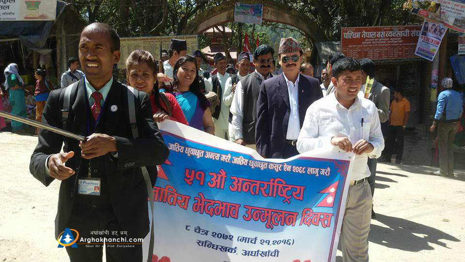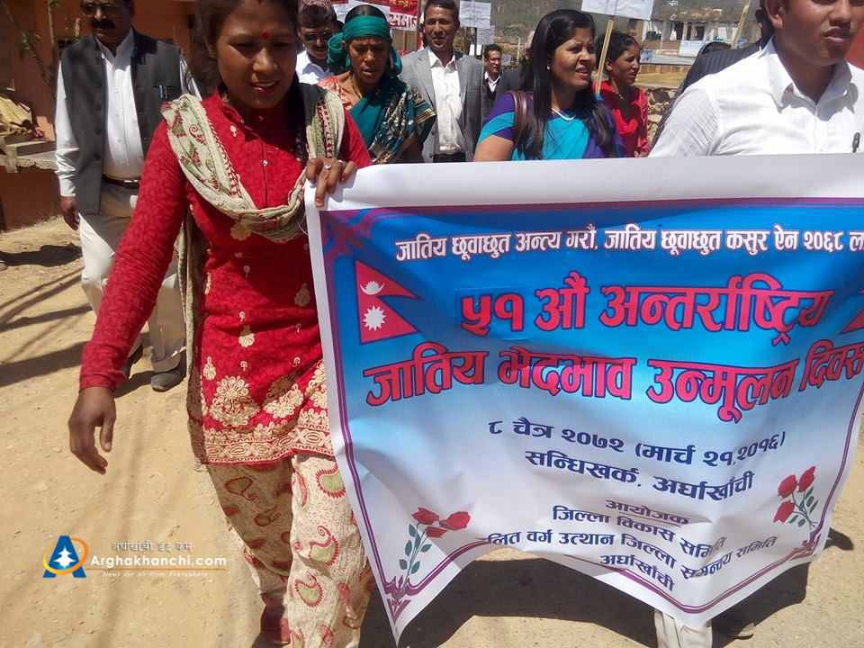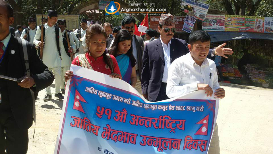 जातीय छुवाछुत अन्त्य गरौ, जातिय छुवाछुत कसुर ऐन २०६८ लागु गरौ भन्ने नाराका साथ भेदभाव विरुद्धको ५१ औं अन्तराष्ट्रिय दिवस अर्घाखाँचीमा पनि मनाइएको हो ।