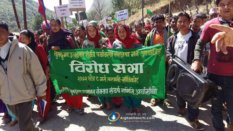 विकासका नाममा नरपानीको प्राकृतिक सुन्दरता र सन्तुलित र समृद्ध वातारणलाई नष्ट गर्न थालिएपछि त्यसको सङ्गठित विरोध पनि सुरू भयो। राष्ट्रिय जनमोर्चाले सुरूबाटै विरोध गर्दै आएकोमा जिल्लाका अन्य राजनैतिक दलहरू र सचेत नागरिक समाजले पनि २०६२ असार २५ गते सन्धिखर्कबाट विरोध सुरू गरे। अर्घाखाँची उद्यो