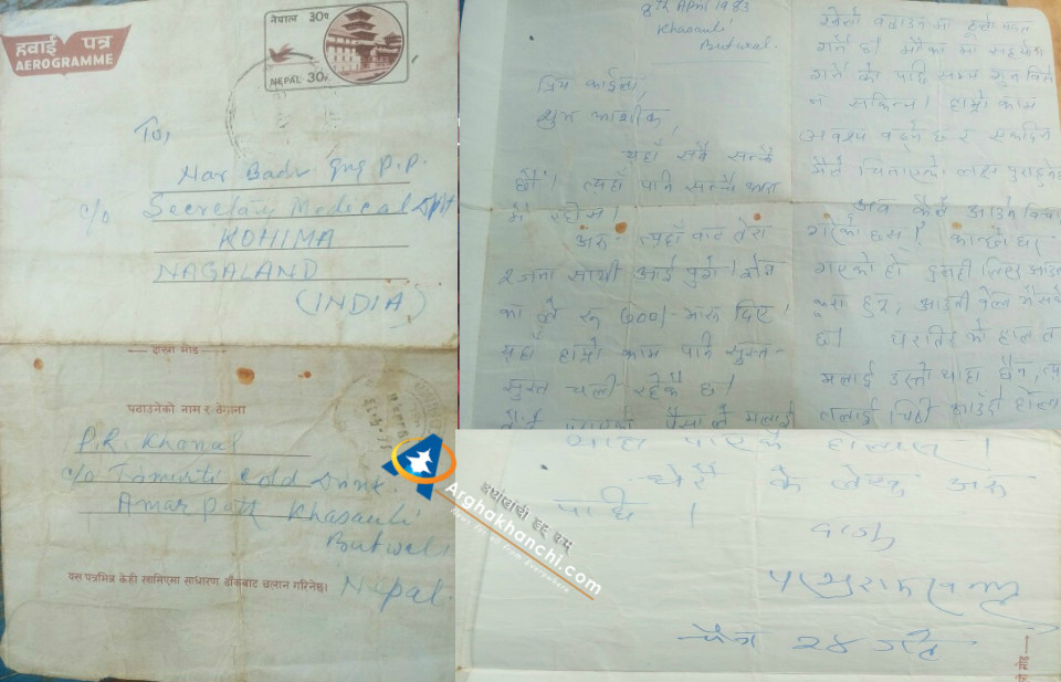 ३३ बर्ष पुरानो चिट्ठी: अहिले सञ्चारको बिकाससगै हुलाकी चिठीको महत्त्व घट्दै गएको छ ,तर आज भन्दा ३३ बर्ष अगाडि बिदेश गएको आफ्नो भाइलाई दाजुले हबाइ पत्र मार्फत लेखी पठाएको हुलाकी चिट्ठीको एक नमुना हो । – राजु खनाल, अर्घाखाँचीडट्कम, प्रकासित मिती: २०७२ चैत्र १२ शुक्रवार