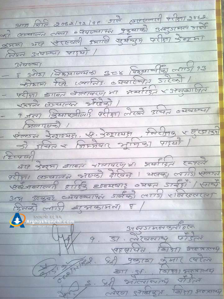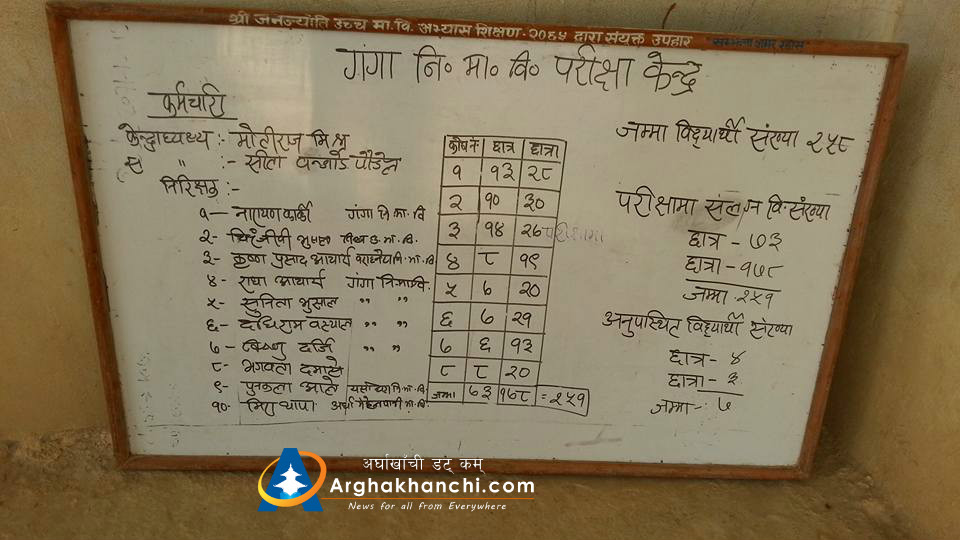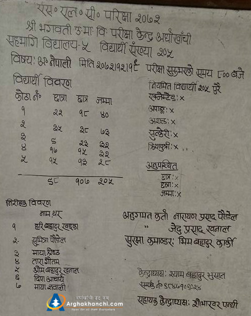 अर्घाखाँची जिल्लाका सन्धिखर्क स्थित श्री अर्घाखाँची आवासीय उच्च माध्यामिक विद्यालय चुत्रावेसी बेलबाटिका केन्द्रमा परीक्षा अनुशासीत, मर्यादीत ,र ब्यबस्थीत रुपमा संचालन भएको साथै परीक्षार्थीलाई आबस्यक पर्ने सम्पूर्ण स्टेशनरी,खानेपानी जस्ता अति आबस्यक सामानहरु कोठाभित्रै ब्यबस्था गरिएको छ ।